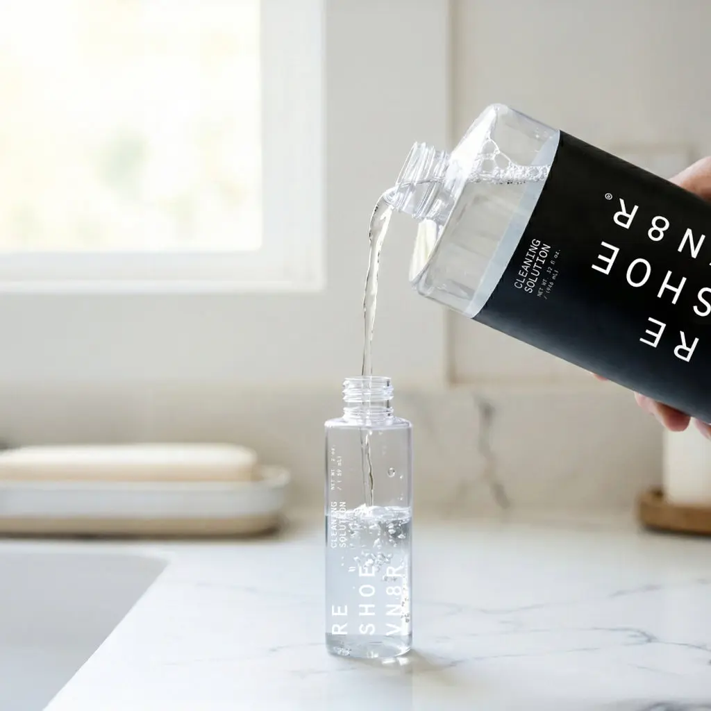 The RESHOEVN8R Sneaker Cleaning Solution is a highly concentrated, all-purpose shoe cleaner that is safe to use on almost any material. Made with 100% natural ingredients, this Solution works to condition your shoes as you clean. Just two squirts of Solution is enough to provide a top-to-bottom deep clean of your shoes.