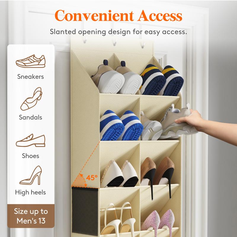 ·Convenient Access: Designed with a slanted opening, our hanging shoe organizer ensures easy access to your footwear. The deeper and wider pockets comfortably fit US shoe sizes 7-13, optimizing the use of space behind the door and keeping your room tidy.