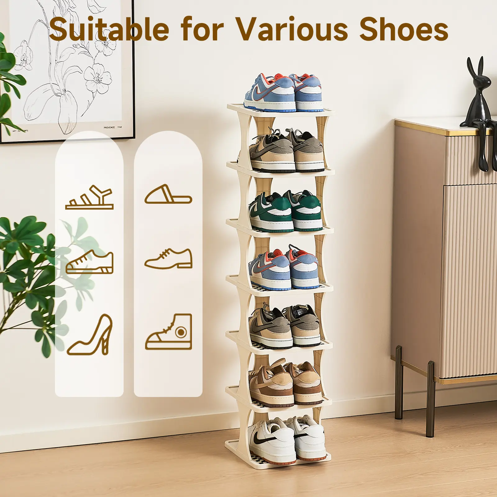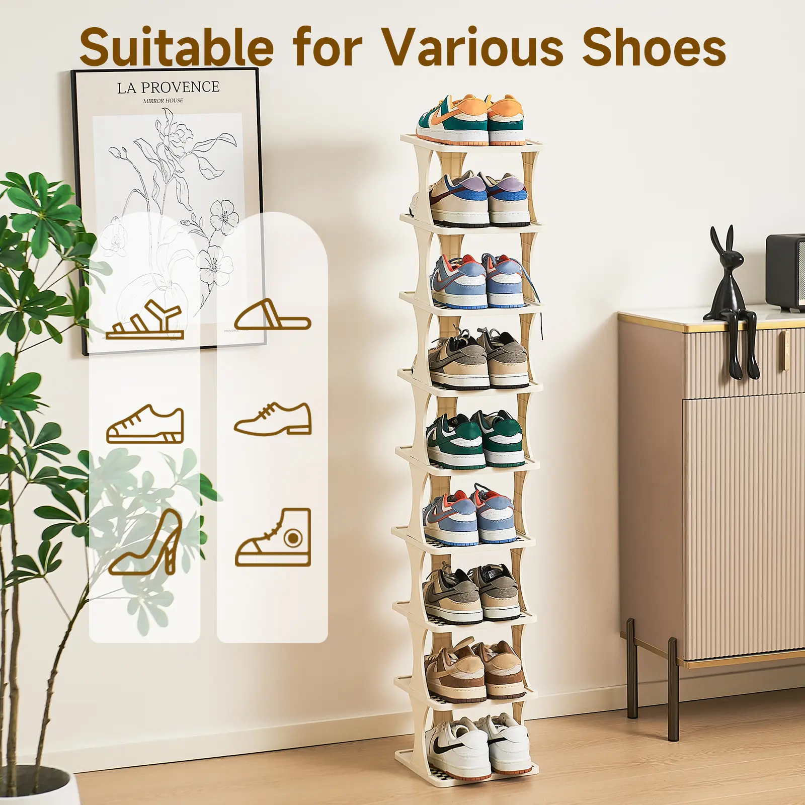 ·【Multi-purpose】 This vertical shoe rack can organize all kinds of shoes, such as sneakers, slippers, flats, high heels and so on. It can also be used as a storage or display shelf for books, photo frames, plants, CDs, decorations and other daily items.