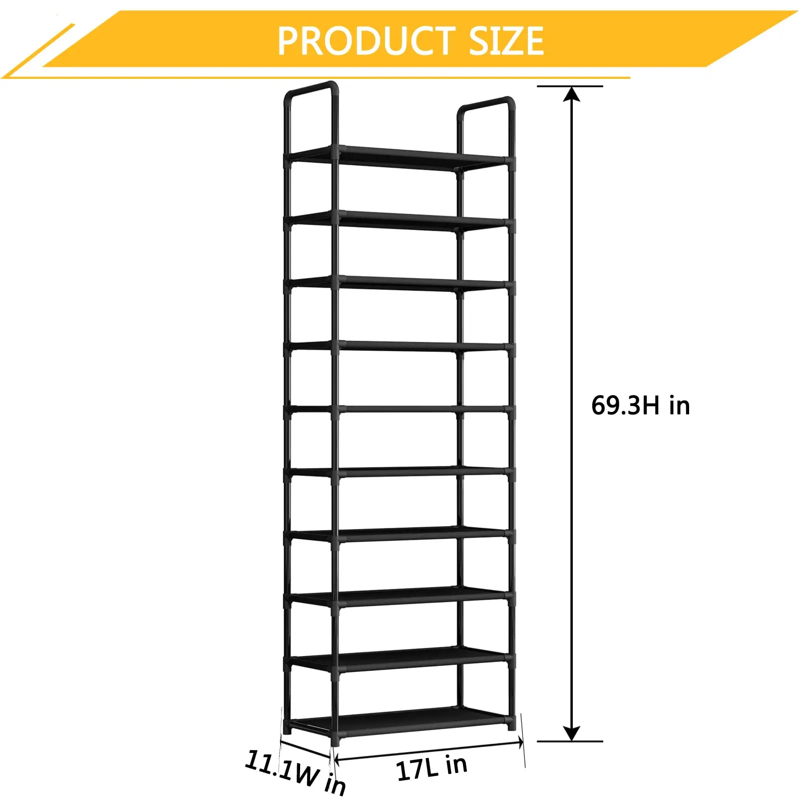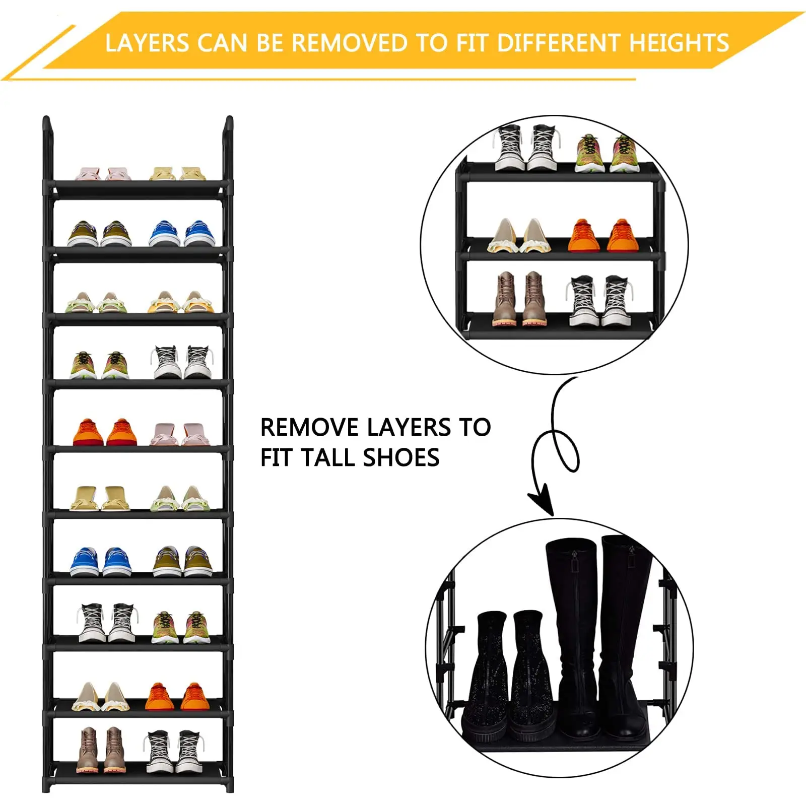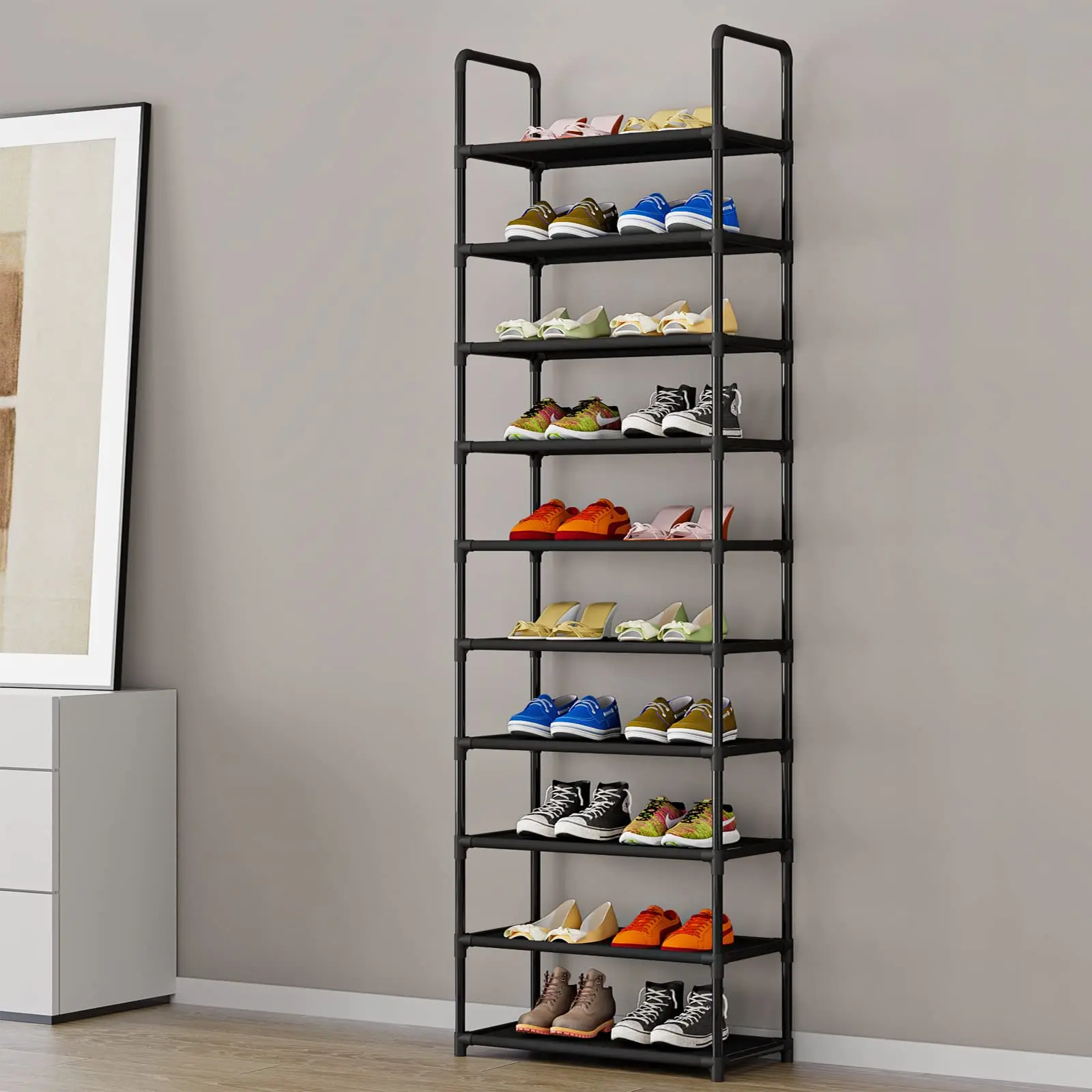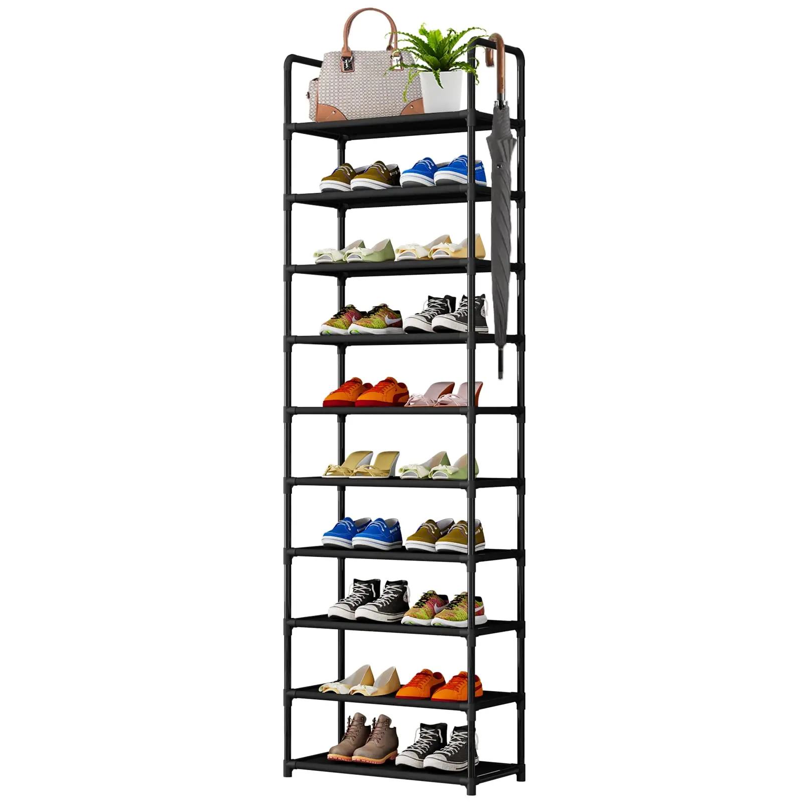 ✨ Large Capacity and Multi-functionality: With 10 tiers, this rack holds 20 to 25 pairs of adult shoes. It's height-adjustable, fitting boots and high heels. Not just for shoes, it also accommodates bags, towels, books, and plants. Versatility at its finest!