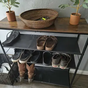 I was a little surprised at the cloth shelves but all in all I'm happy with this shoe rack. Best part is that I was able to leave the bottom shelf off so our boots would fit. Easy to assemble too.