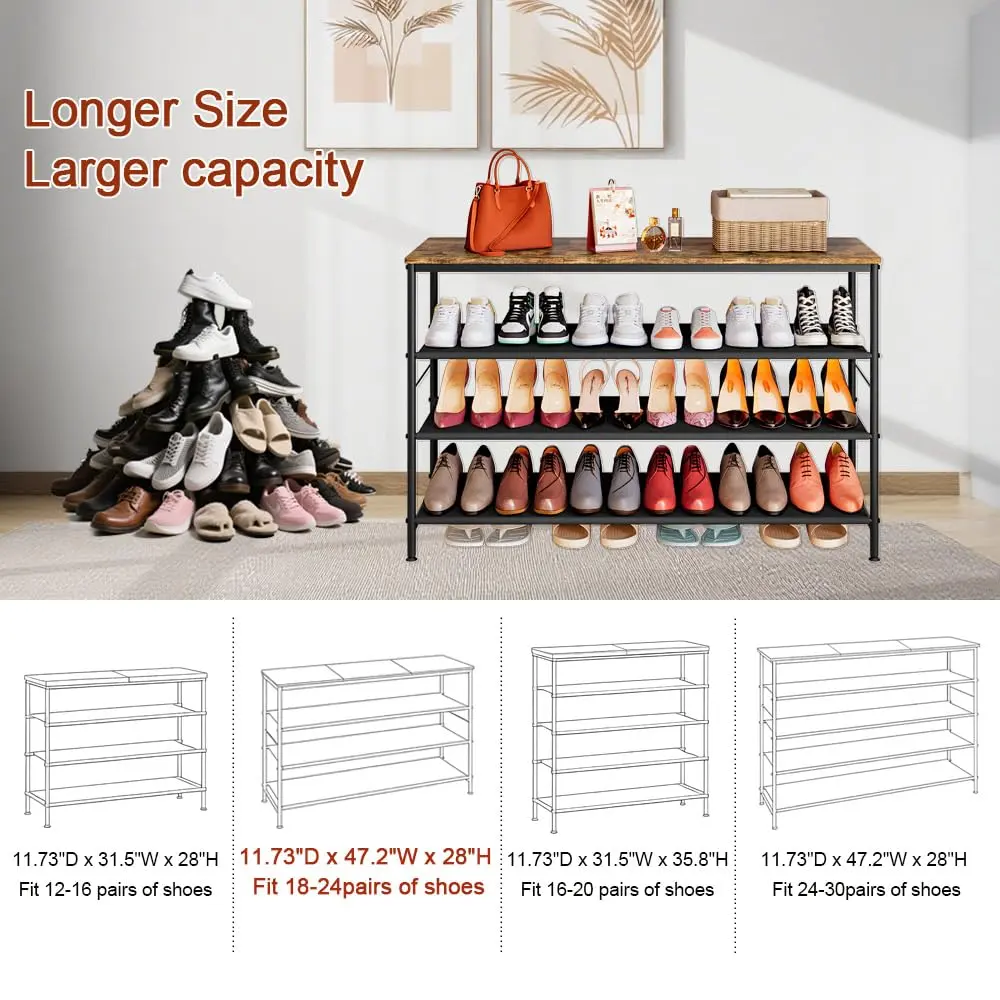 This rack looks great, It fits our boots size 11 and 8. The height is great if you want to put keys or decor on the tabletop. When I opened the box I was a bit leary of the construction and strength of the shoe rack. I did not give 5 stars because they only had 3 pieces of the fabric👎