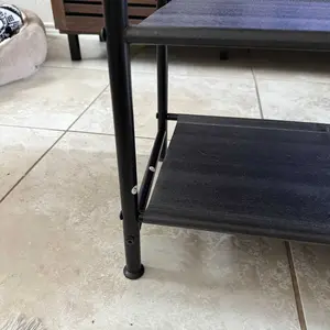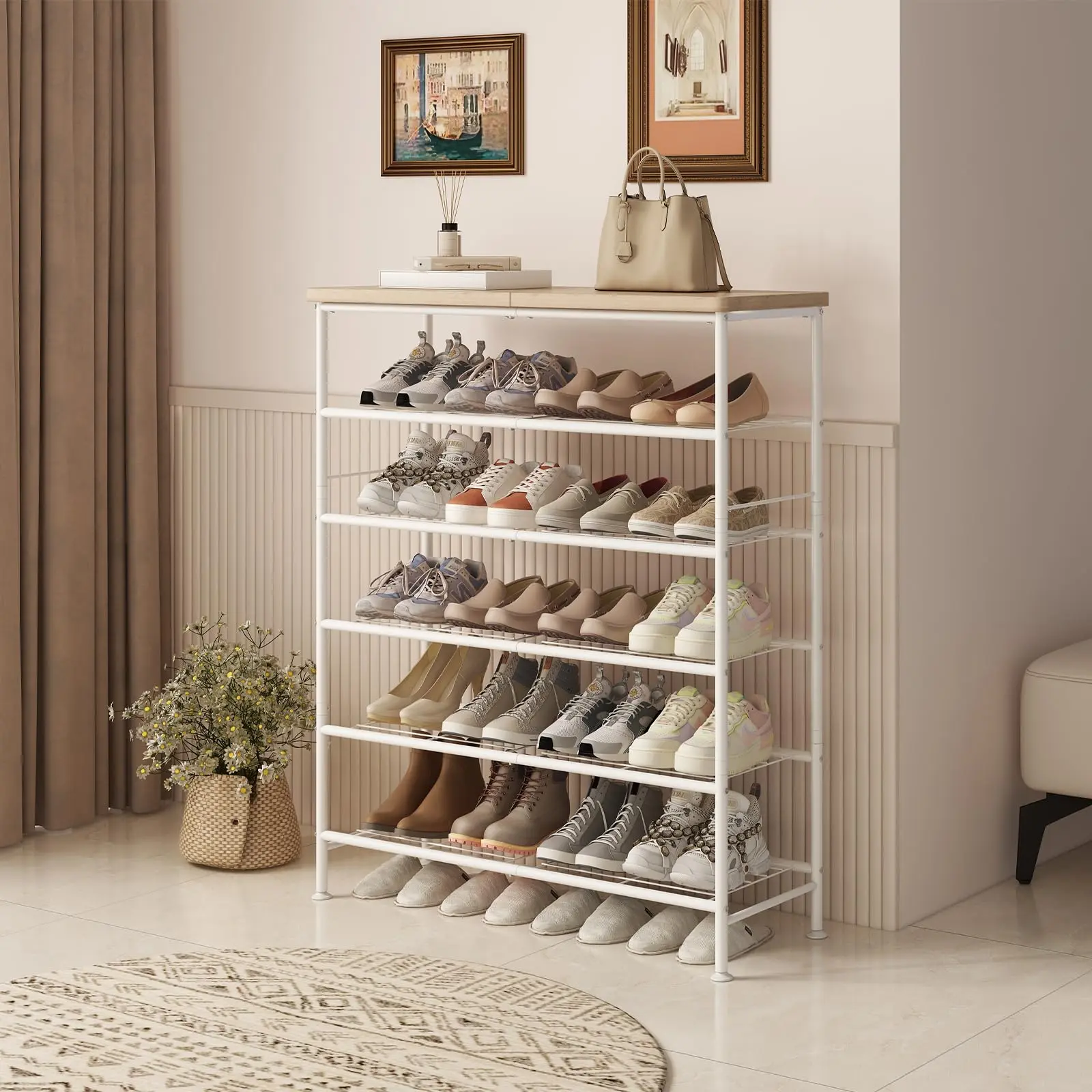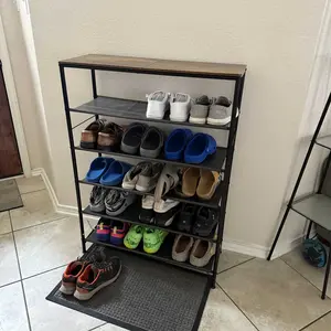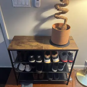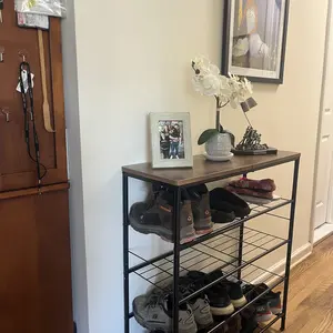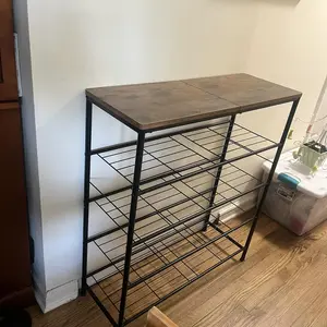 The rack is sturdy, and the wood top looks nice. My only gripe is that I got some fabric racking to put the shoes on instead of the wire racking as shown in the pictures. Still works fine, but just a bit more difficult to clean since all the debris from our shoes stays on the fabric.