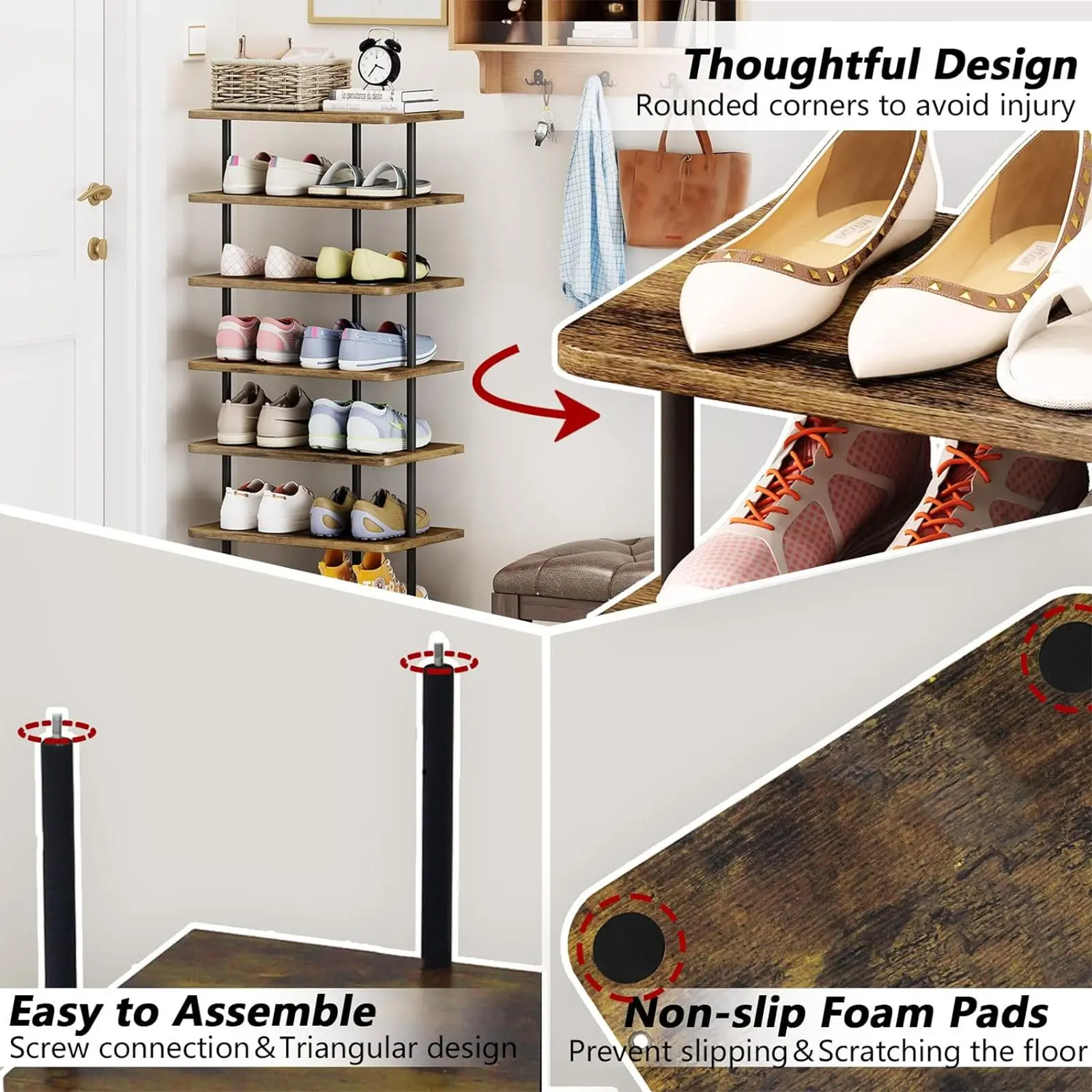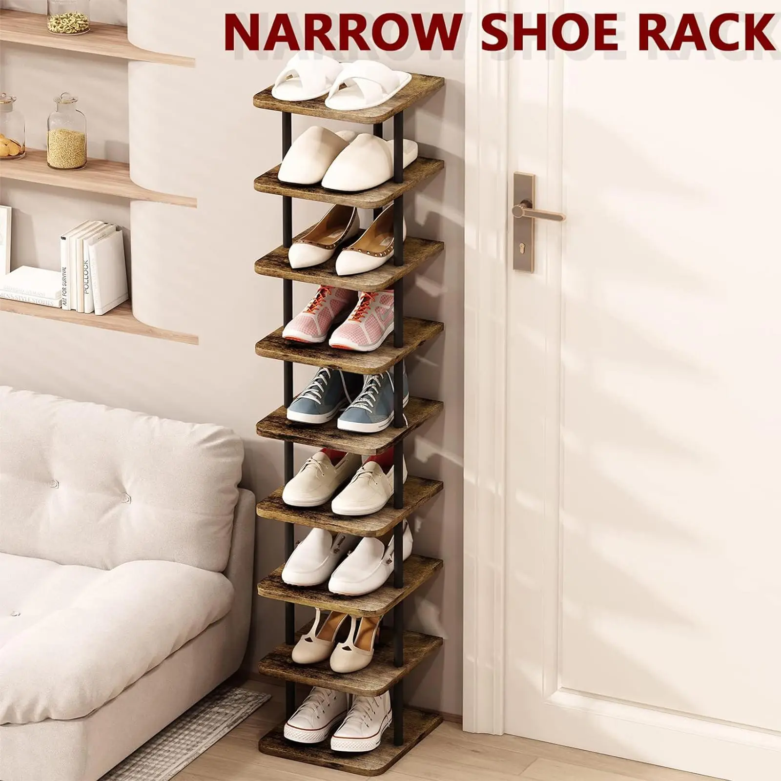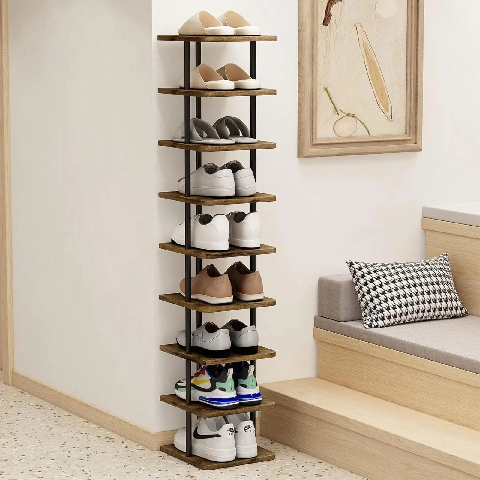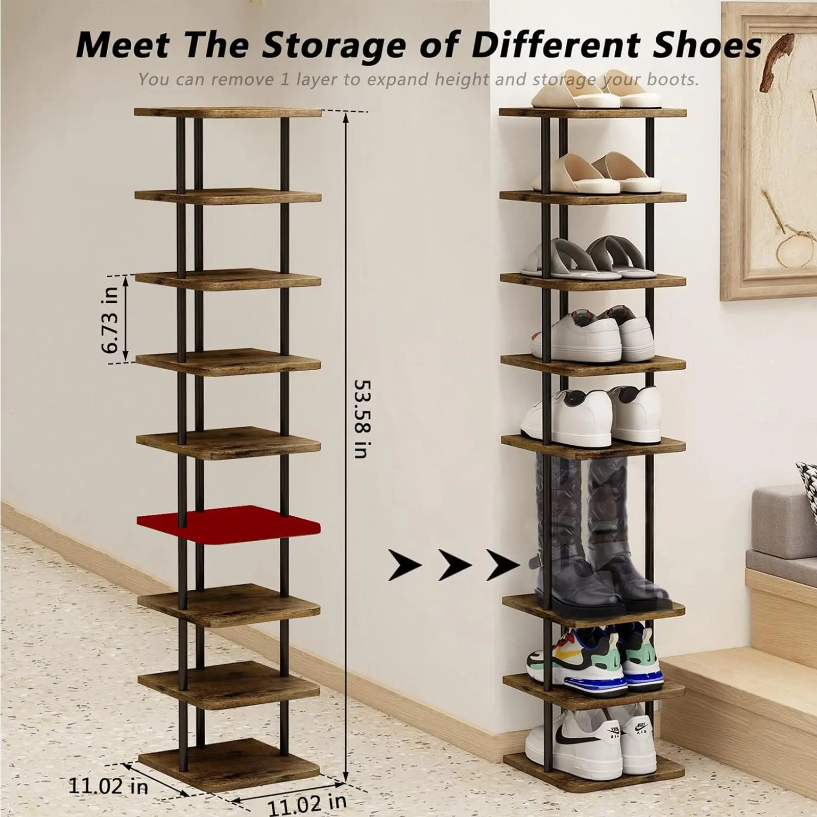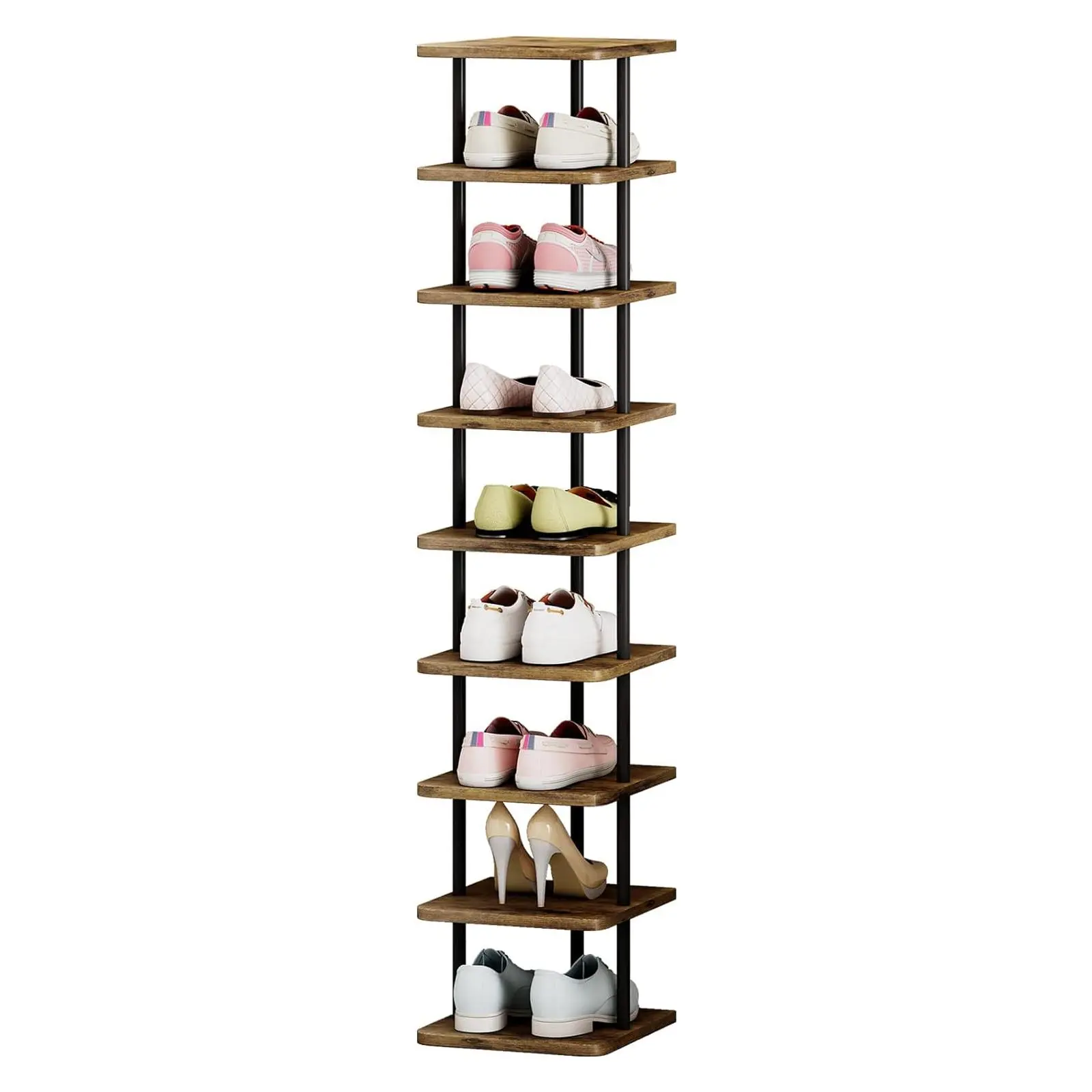 ·【Space Saving Shoe Rack】: The large size of 11.02"L x11.02"W x40.27"H makes this shoe rack the ideal storage solution for any narrow or small space such as hallways, closets, dorms, cupboards, garages, etc.