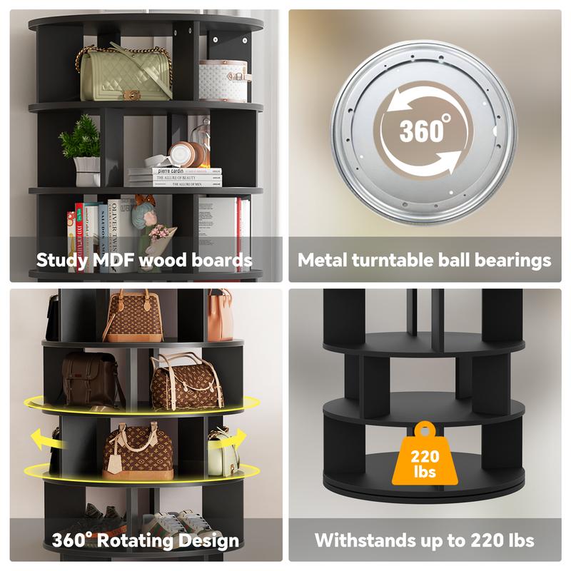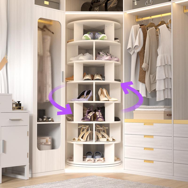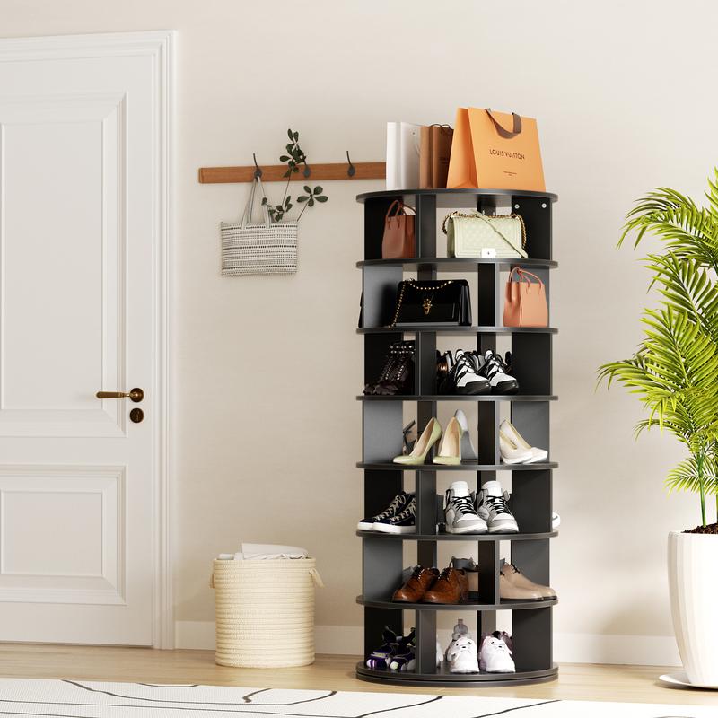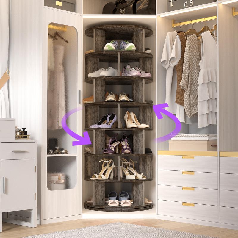 ·The image shows a 7-tier rotating shoe rack in a modern setting, used for storing shoes, handbags, and other items. It is placed in a closet or entryway. 📸