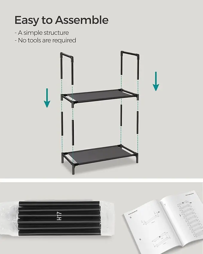 Seems to be good quality, it’s sturdy but light, and overall has room for plenty of shoes! It’s great I like it!! It does come with a lot of pieces but it’s quite easy to understand and build on your own. I set mine up to be 5 tiers each since there’s not enough room in here lol