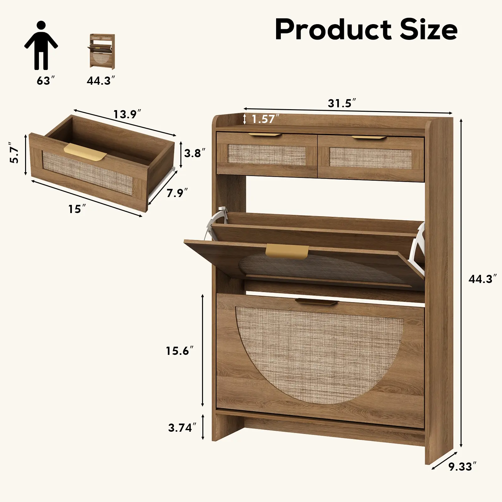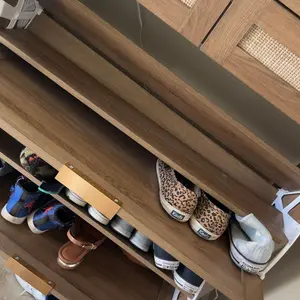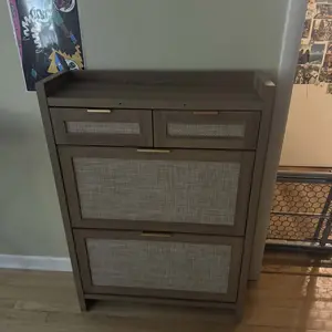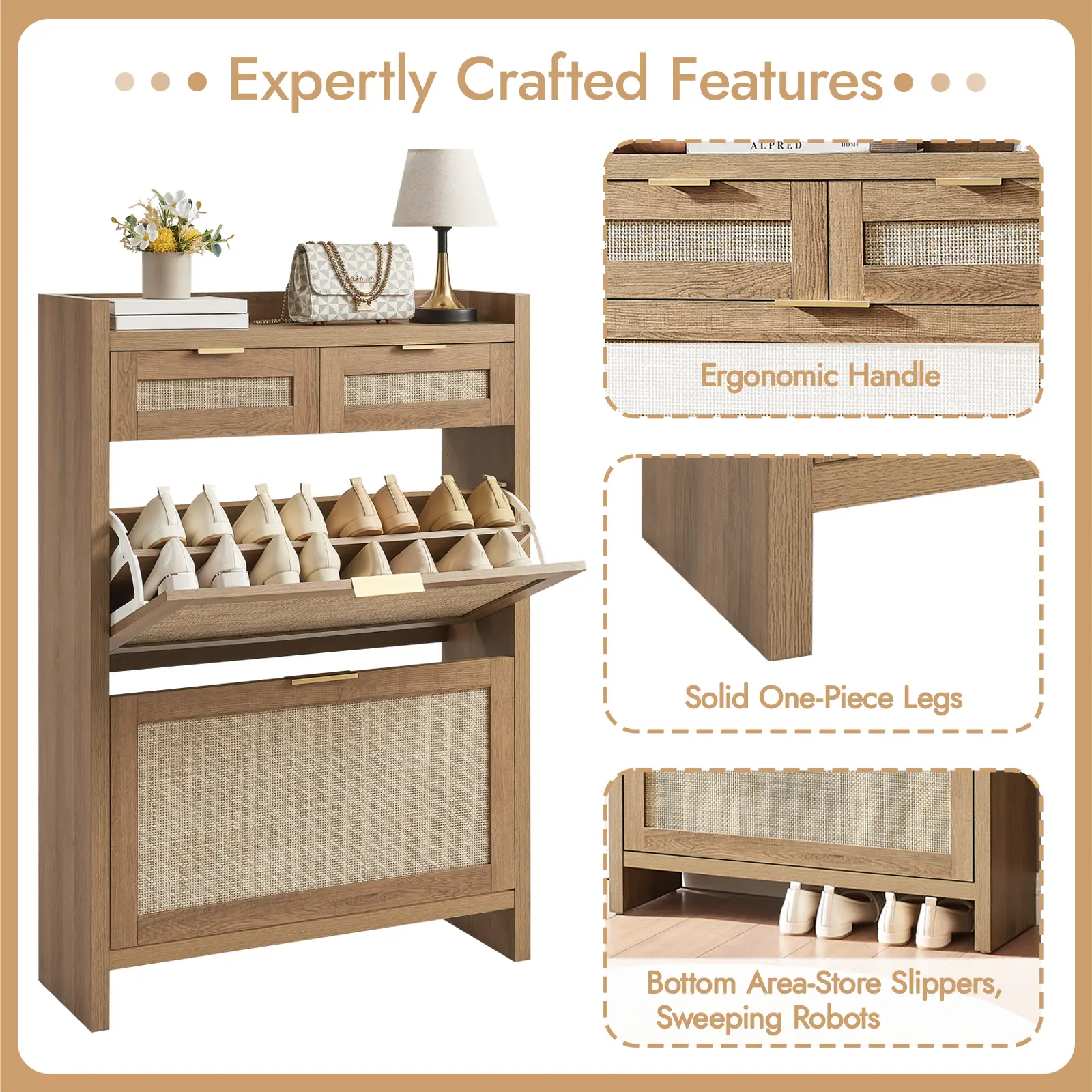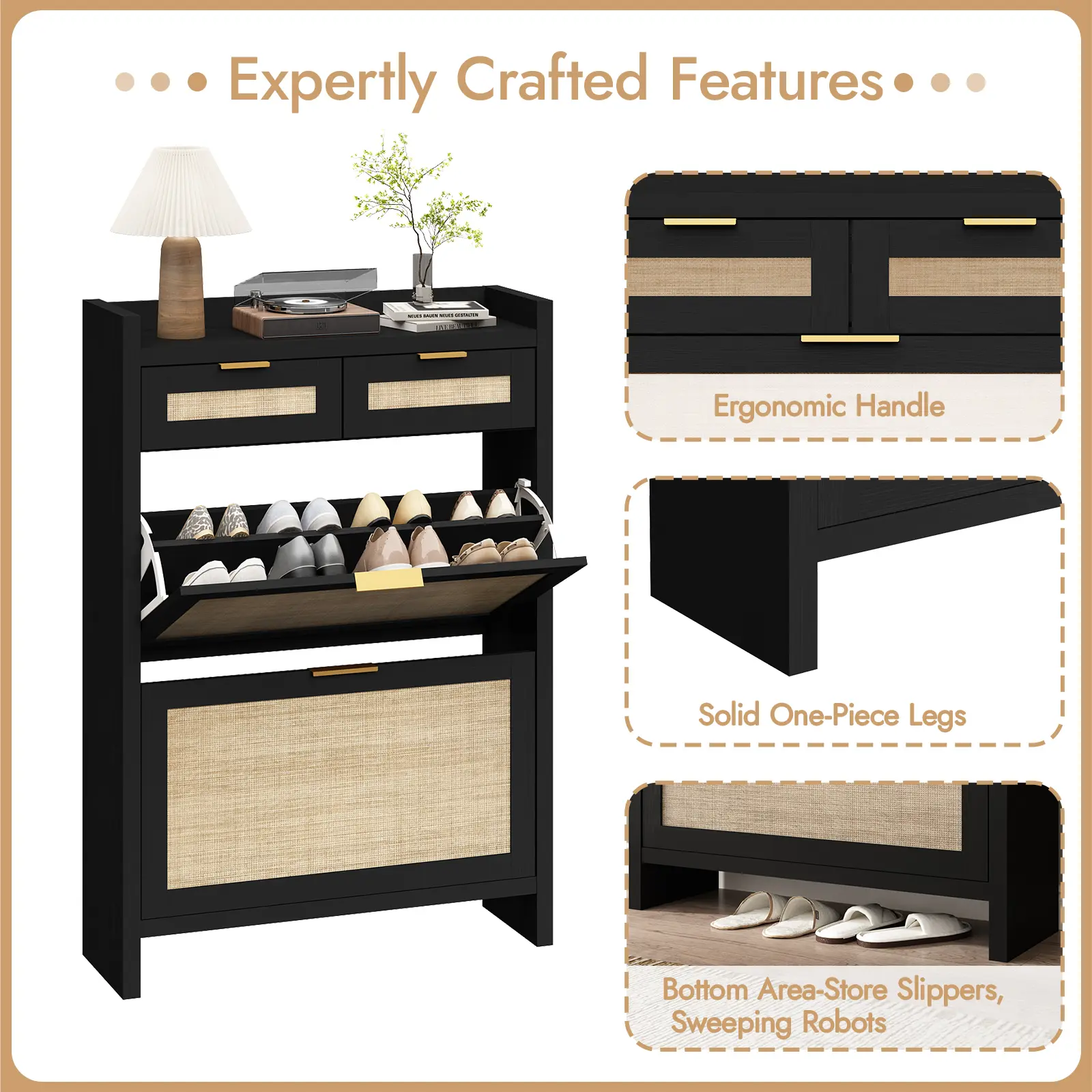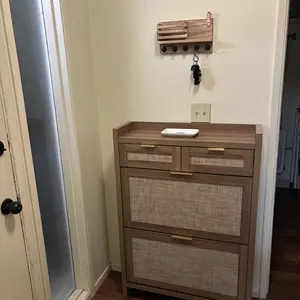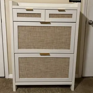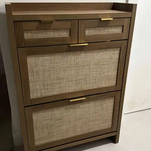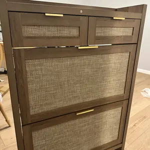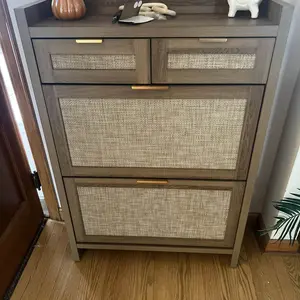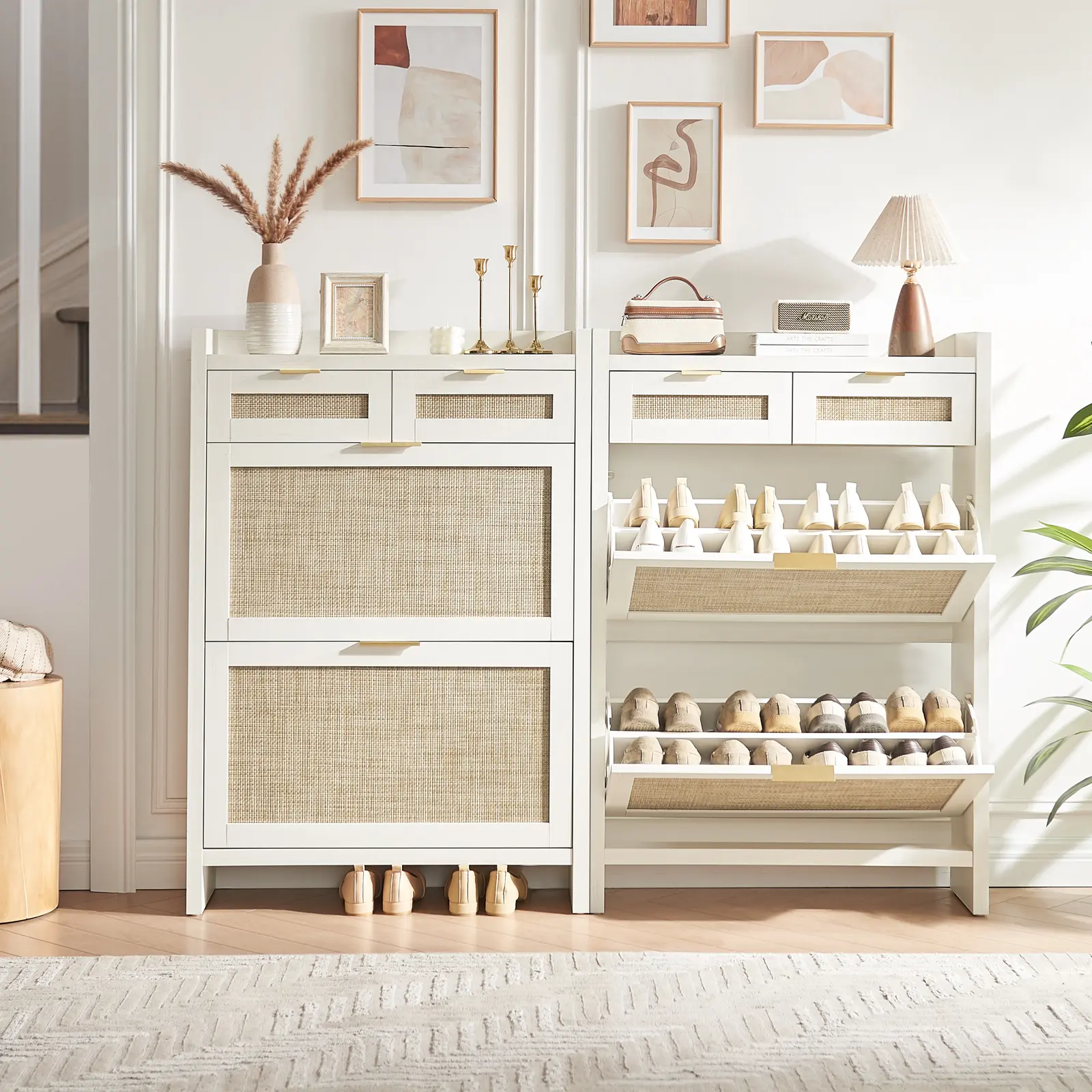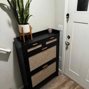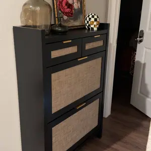 ·Modern & Classic Design-Enhance your home with this stylish storgae cabinet, blending modern and farmhouse elements. Featuring wooden cabinet, handwoven rattan drawers, and gold metal handles, it adds elegance and charm to any space. Whether in the living room, nallow hallway, or entryway, this shoe organizer brings a fresh, beachy vibe, complementing any décor with its timeless yet contemporary design.