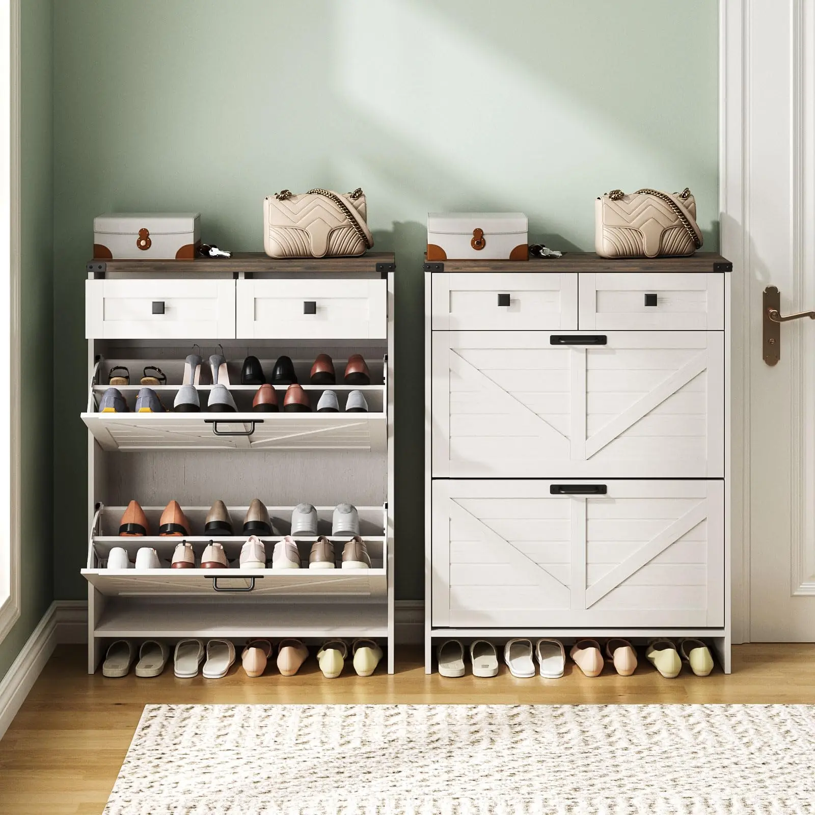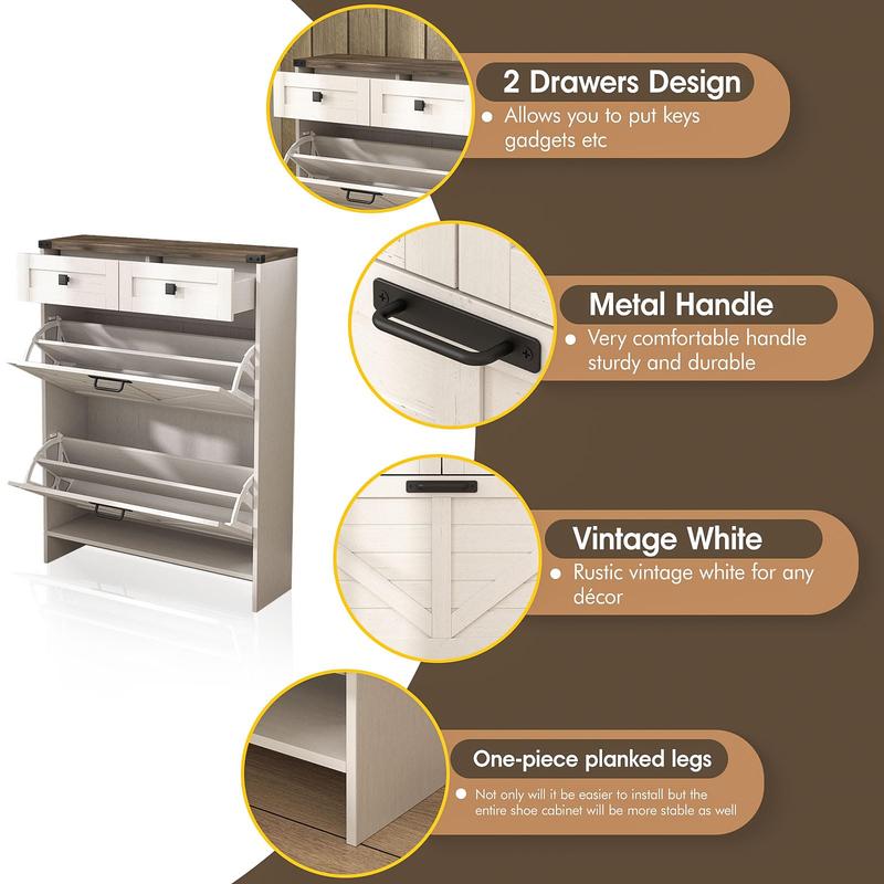 Farmhouse Shoe Cabinet For Entryway:The hidden shoe storage cabinet with 2 flip drawers in a chic rustic white finish. Simple and stylish, making it an ideal addition to your entryway.. Perfect for placing in the entryway,hallway,living room,or porch,provides a neat looking in your home and space saving.