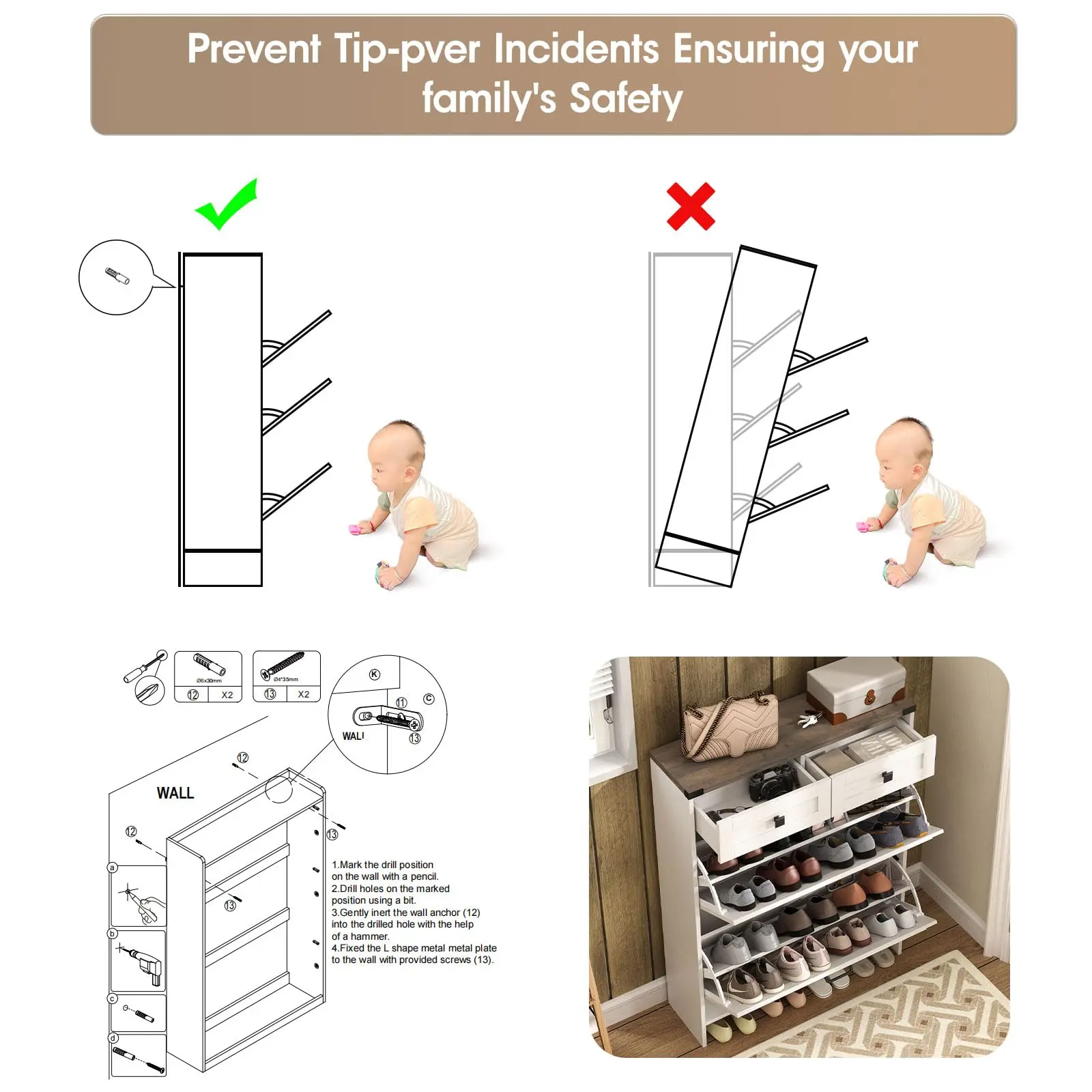 Easy to Assemble, Clear Instruction: The shoe organizer storage cabinet includes all parts, hardware, and clear installation instructions. Every part has corresponding labels. if you have any product problems,please contact us in time,all problems will be solved within 24 hours.