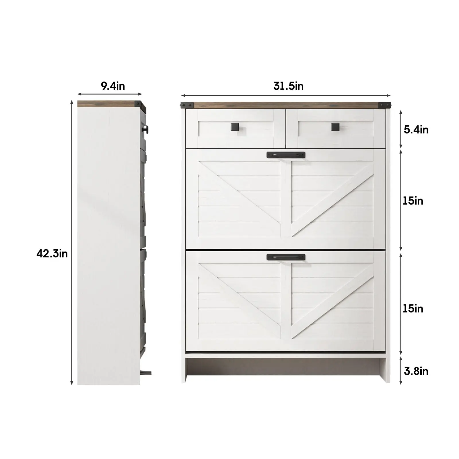2 Flip Drawers&2 Drawers Shoe Cabinet:This shoe cabinet has 4 Drawers in total,2 of the drawers are for daily items.For 2 flip drawers and 2 tiers inside for each drawer, It features a removable divider in each compartment,you can choose to keep or remove the panel according to the size or style of your shoes.