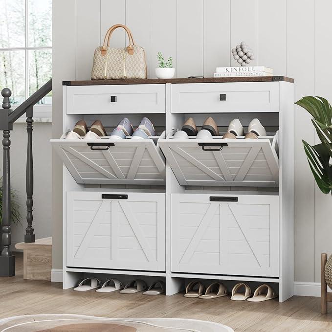 ·Farmhouse Shoe Cabinet For Entryway: The hidden shoe storage cabinet with 4 flip drawers in a chic rustic grey finish. Simple and stylish, making it an ideal addition to your entryway.Perfect for placing in the entryway,hallway,living room,or porch,provides a neat looking in your home and space saving.