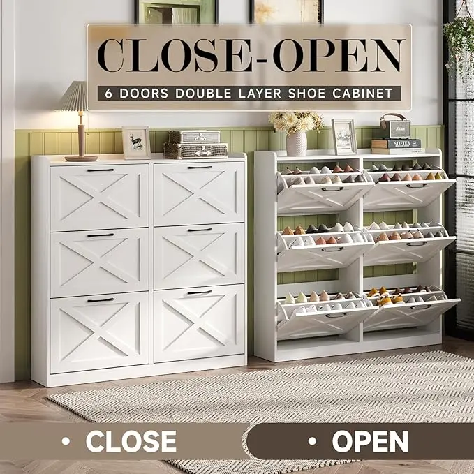 ·Entryway Shoe Cabinet: The hidden shoe storage cabinet with 6 flip doors, stylish and simple white makes it a neat and beautiful finish and looks great in many different home styles. Perfect for placing in the entryway, hallway, living room, or porch, provides a neat looking in your home and space saving