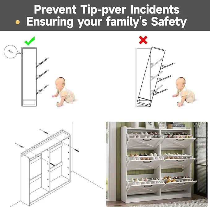 ·Safe and Reliable Quality: This slim shoe cabinet contains an anti-tipping device, which can be fixed on the wall to prevent tipping and protect children's safety. Made of high-quality MDF wood, the stable structure ensures super load-bearing capacity. The black metal handle is simple and elegant, feels comfortable, and prevents scratches and injuries during use. It can be easily cleaned with a damp cloth