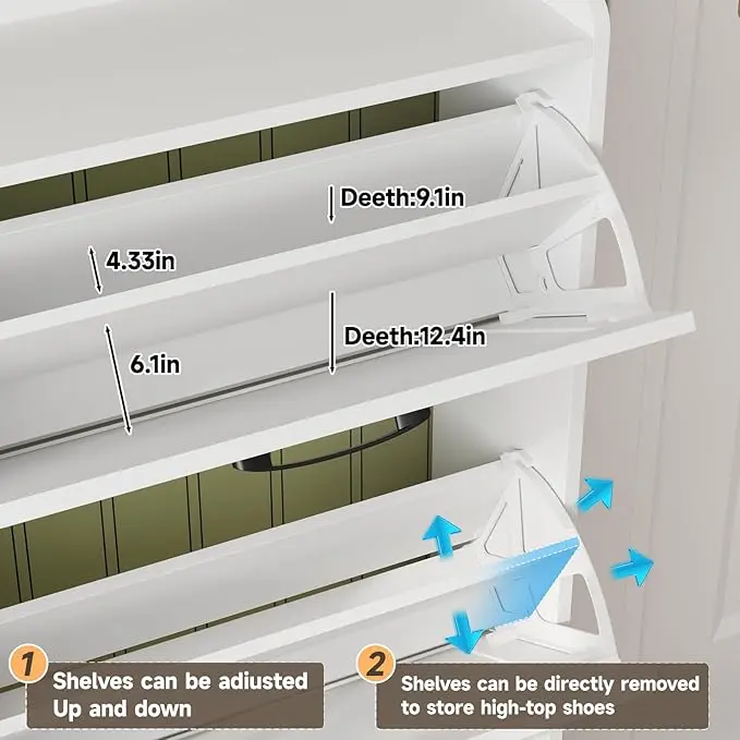 ·Narrow Shoe Cabinet: Most other shoe cabinets have a depth of 14-15in, while our slim shoe cabinet depth front to back is 9.35in! Only half the volume of other shoe cabinets, but it can neatly hide and store more and larger shoes! Innovative flip space-saving design, bringing more space in the entry area or hallway