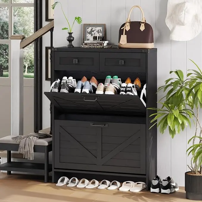 2 Flip Drawers&2 Drawers Shoe Cabinet:This shoe cabinet has 4 Drawers in total,2 of the drawers are for daily items.For 2 flip drawers and 2 tiers inside for each drawer, It features a removable divider in each compartment,you can choose to keep or remove the panel according to the size or style of your shoes.