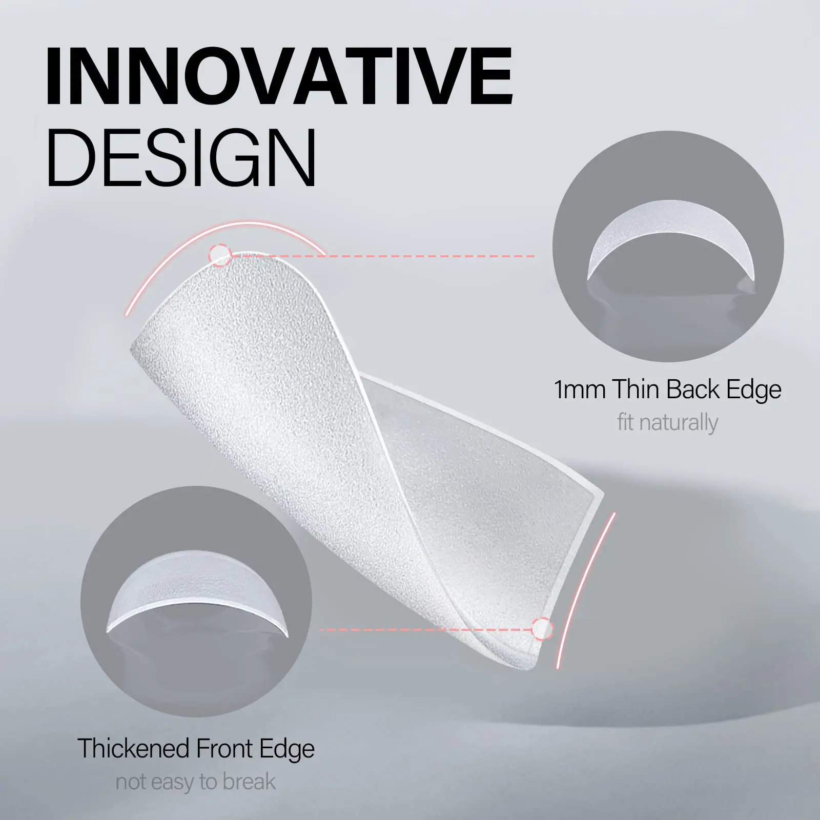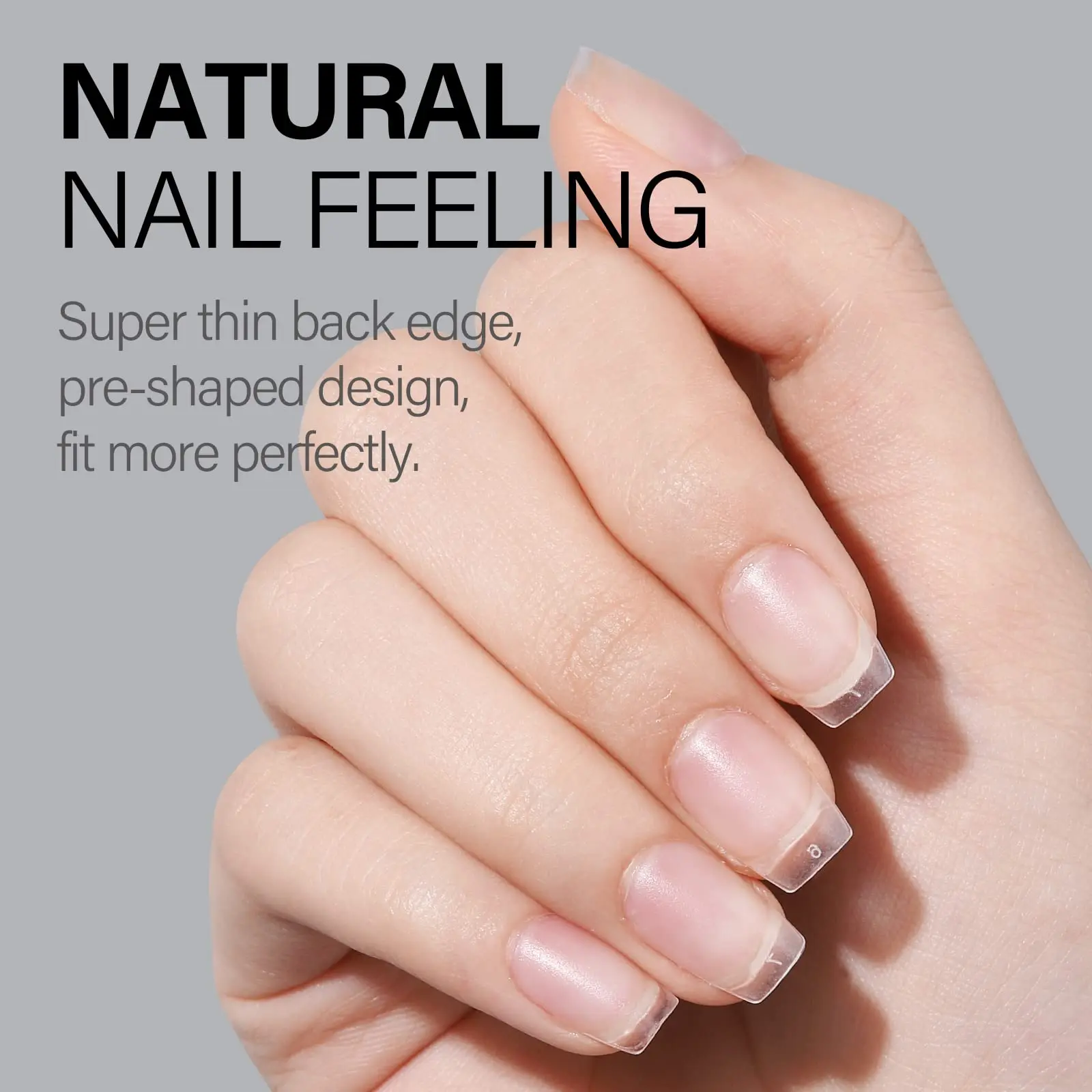 ·ăNATURAL FIT EFFECTă Our soft gel tips feature â Thin back edge, thick front edgeâ. The thinner back edge can make the full nail tips fit your nails better, which will not make you feel uncomfortable. Also, the clear nail tips are more breathable, which will not cause burden and pressure on your fingers; The thickened front edge makes it not easy to break or bend, having longer lifespan. Just like your natural nails, do whatever you want!