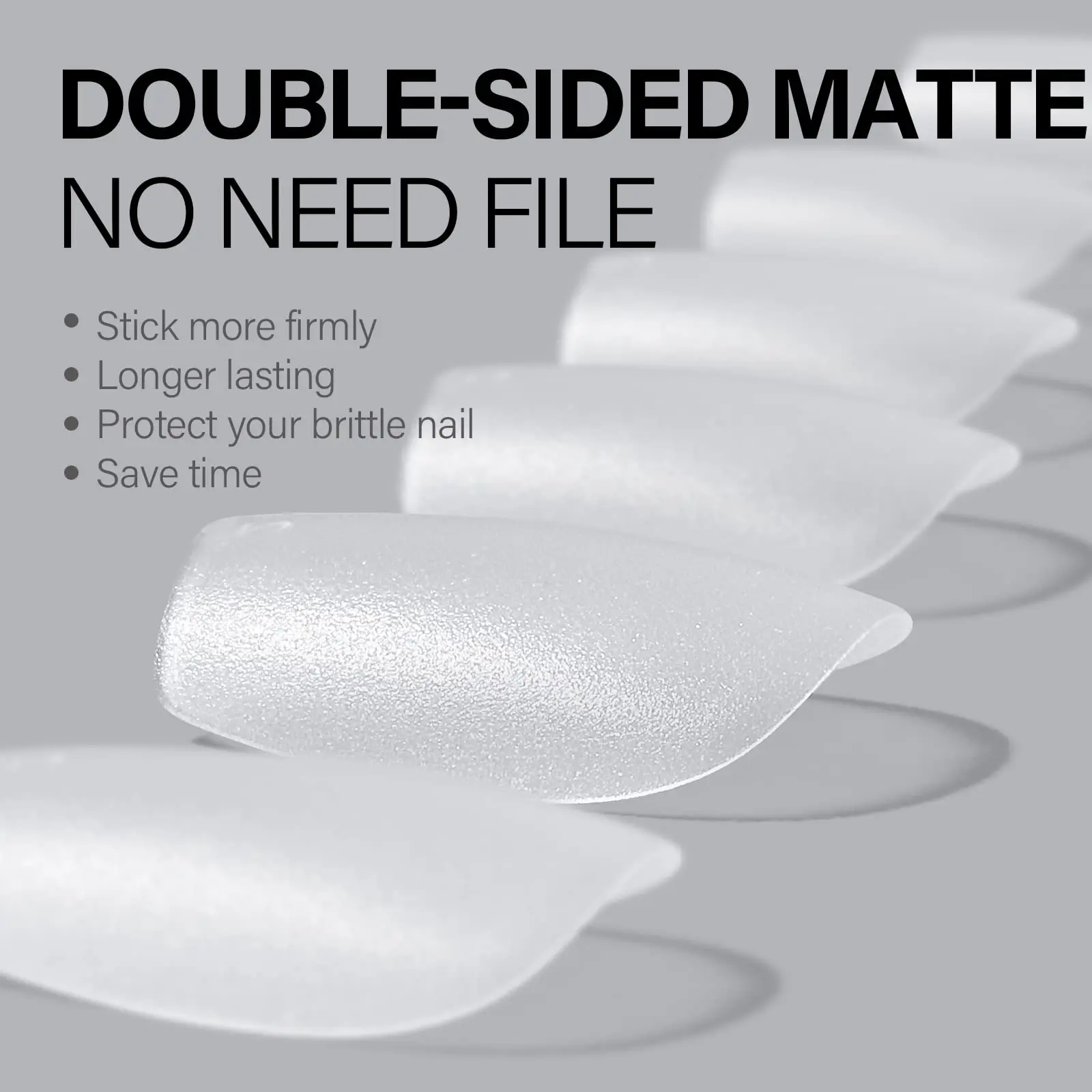 ·ăFULL MATTE TEXTUREă Why choose AILLSA nail tips? Choosing upgraded double sides full frosted texture, the gel nail tips feature stronger adhesion, better fitting your natural nails. Using this acrylic nail tips, you can enjoy the privilege of â NO NEED FILE, NO NEED BASE COAT â. No worry that your nails will become thinner and uglier due to polishing, providing better care for your nails. Without base coat, you also can get the manicure effect you want, saving time and money.