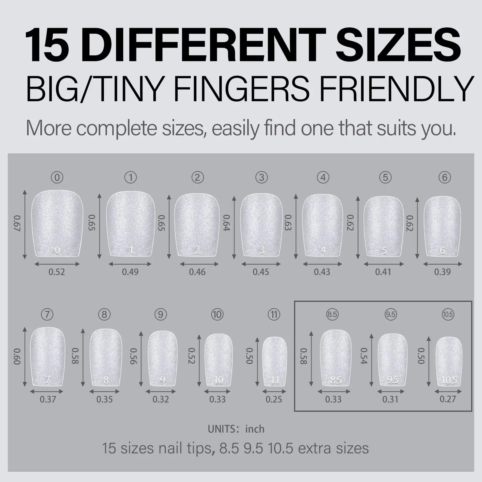 ·ăEXTRA SHORT SIZESă Our nail tips are upgraded the nailsâ length, friendly to short nail bed, more like your natural nails, without hindrance for daily life and work. Including 15 different sizes with each size 30pcs, totally 450pcs, our fake nail tips can provide you with more options. And there are numbers â0-14â marked on the tips, with storage bar design, easy to choose size and remove off. Also, the jelly nail tips are pre-shaped, suitable for professional manicurist and even beginner.