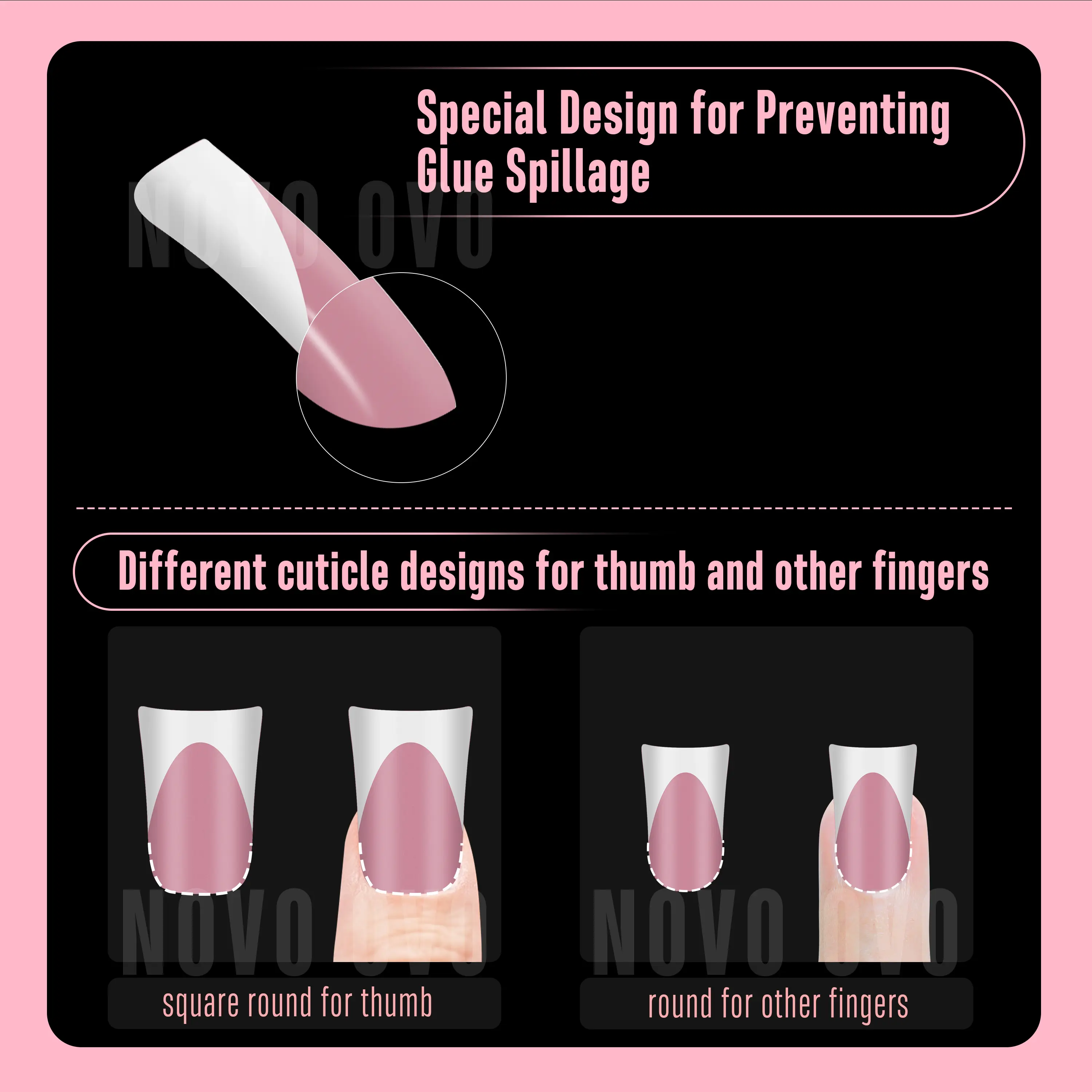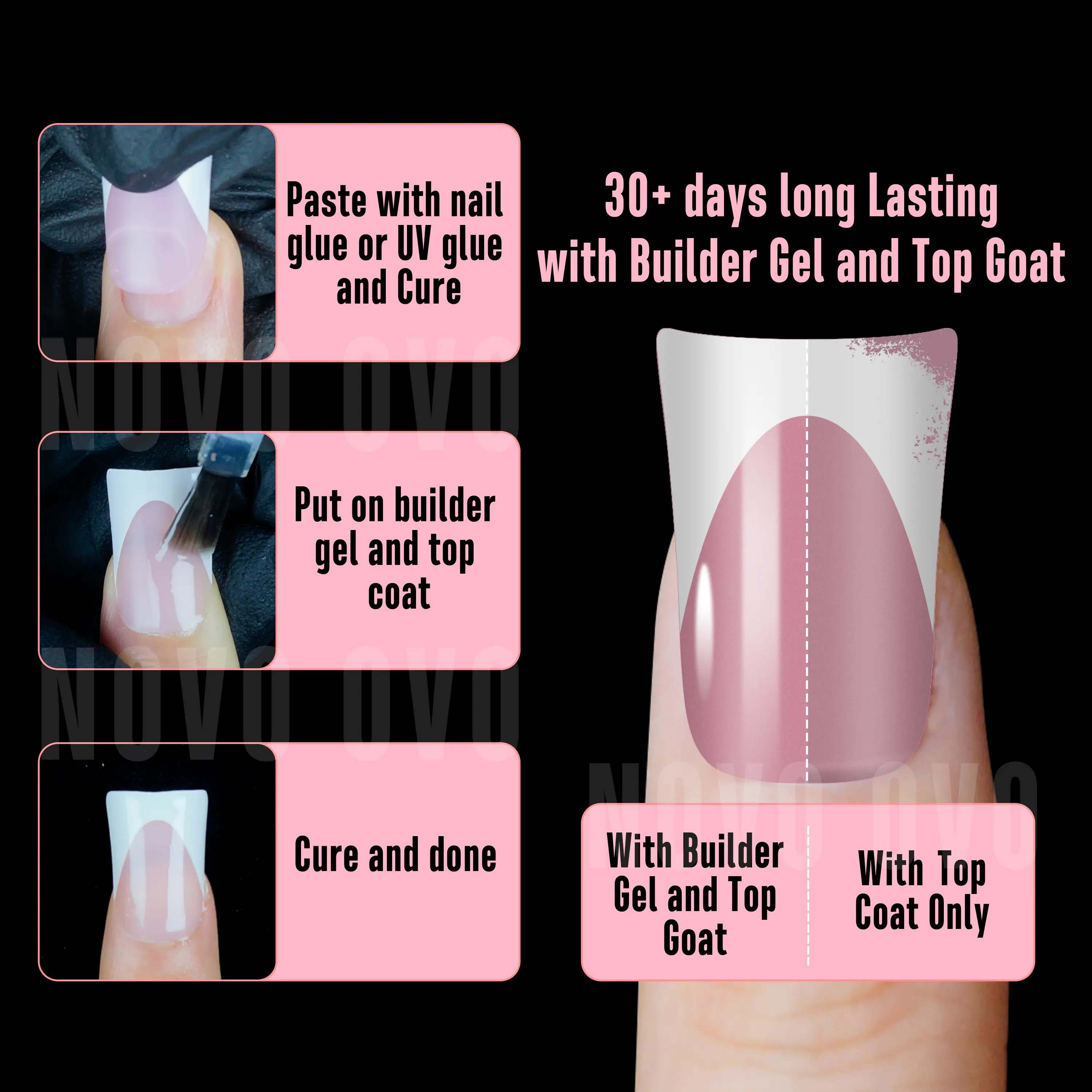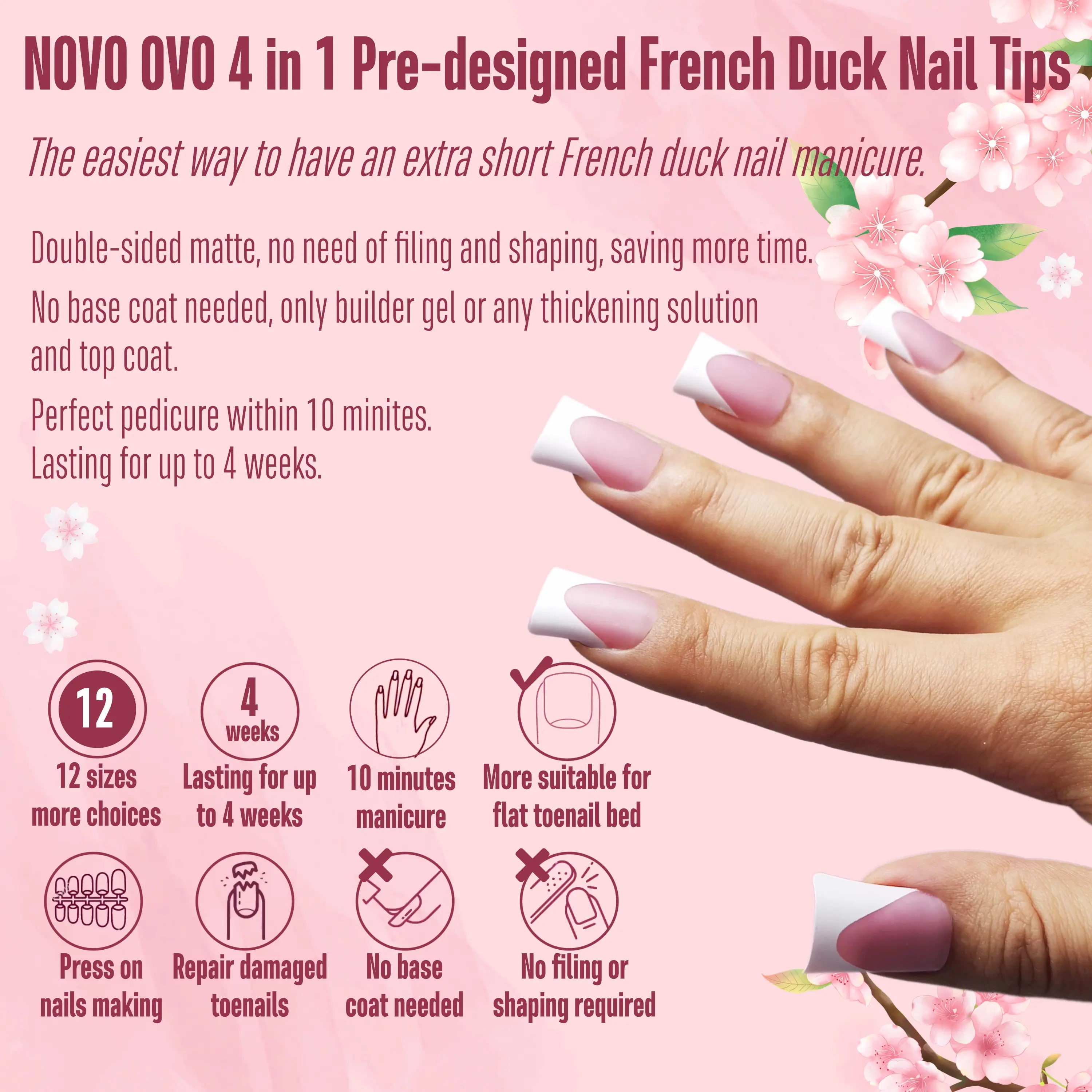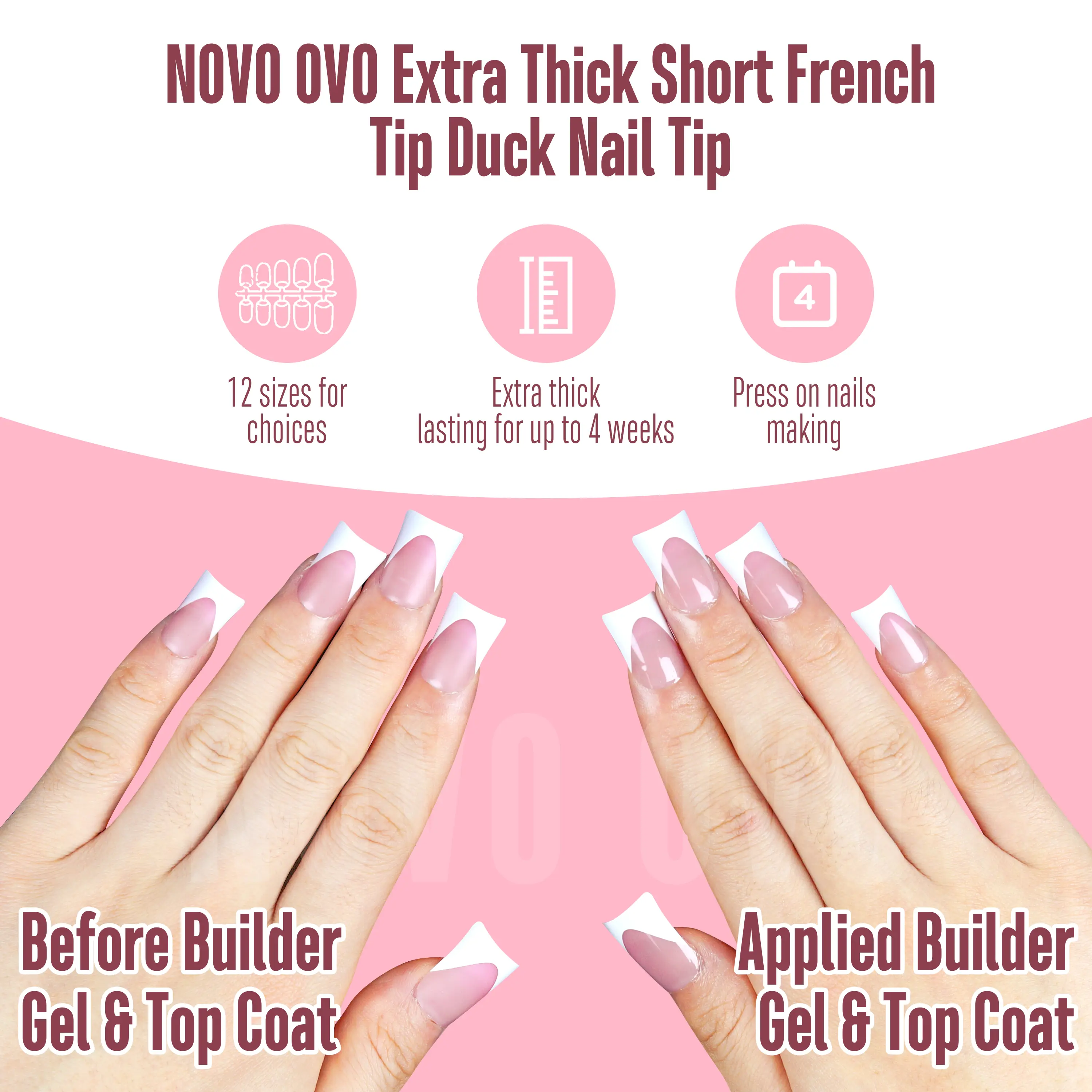 ·GET A SIMPLE FRENCH TIP DUCK NAIL PEDICURE WITH JUST 3 STEPS: NOVO OVO pre-designed nails are here to make your manicure easier! We've already applied a tip primer and base coat on the soft gel nail tips. Simply stick them on your nails with UV gel or glue, then add a layer of builder gel and top coat. In just 15 minutes, you'll have stunning French Tips duck nails on your hand!