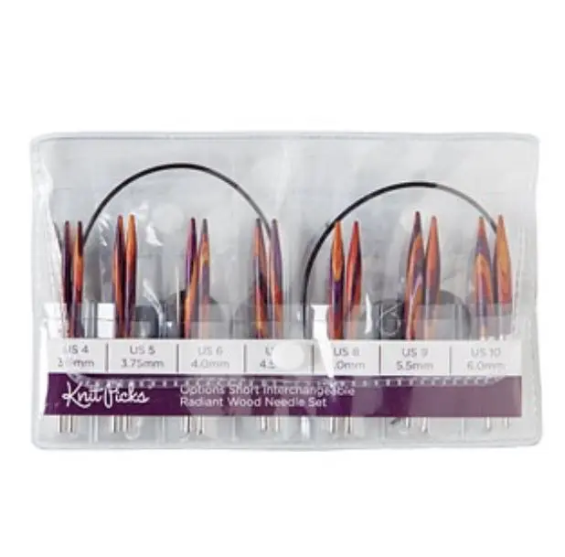 Lovingly referred to as "shorties," these needles are shorter versions of our regular interchangeable needles. Perfect for small circumference knitting, the Radiant Options Short Interchangeable Needle Set features laminated birch layers. The vibrant Radiant colorway includes red, orange, yellow, and purple, contrasted with dramatic black cables. Each tip is 2-3/4" long, connecting snag-free to special cables for a 16" length.