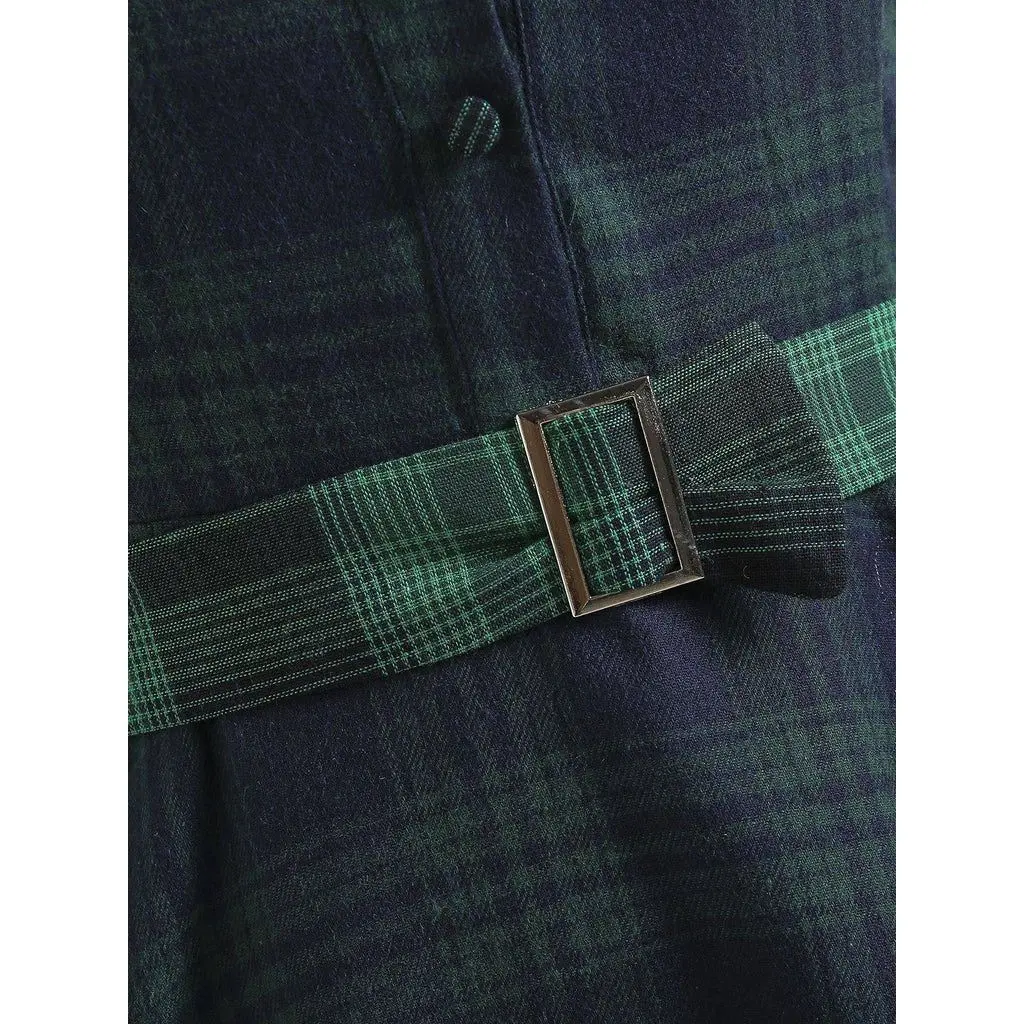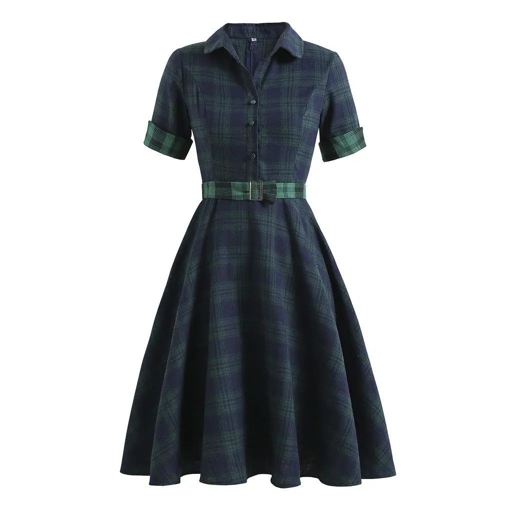 Retro Stage 1950S Green Plaid Short Sleeve Shirt Dress with Cinched Waist & Flared Skirt for Casual Outings & Dates - Classic Look & Comfortable Fit Womenswear Collared Shortsleeve Summer Basic Minimalist Vintage Girly Clothes Suits Gamis Fitted
