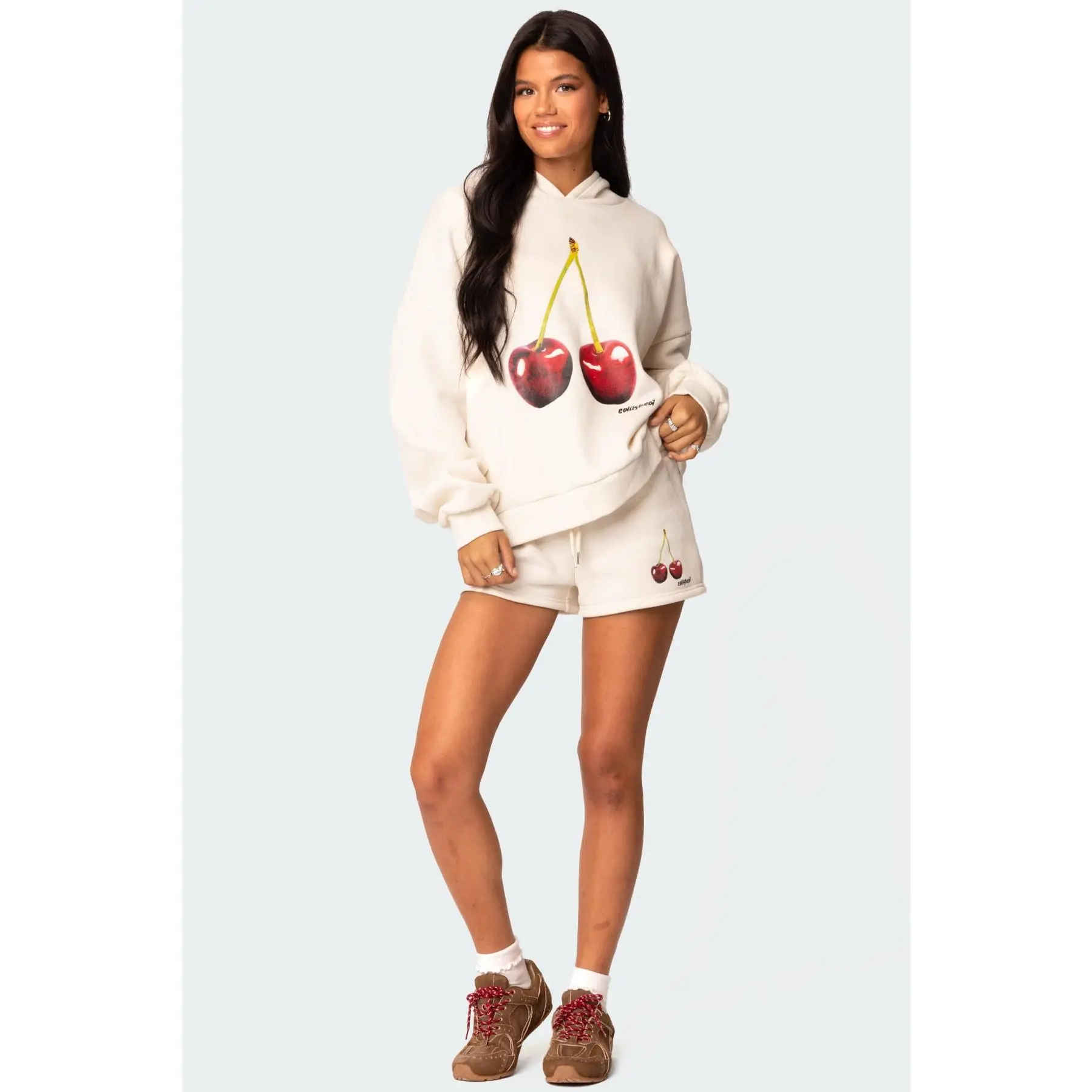 SO COMFY!😮‍💨 shop above👆✨    #cherryaesthetic #lanatok #autumnfashion #fallaesthetic #edikted #falldealsforyou #coquette #vanillagirlaesthetic #cutehoodies #vanillagirloutfits #matchingset #toptieroctober #errandswithme #errandsoutfit     The mon cheri hoodie features an adorable cherry graphic on the front and comes in a lovely creamy white. It’s SUPER soft and cozy inside, making it perfect for lounging or being comfortable running errands. The only downside? No pockets! The matching mon cheri shorts come seperately but complete the set, with a drawstring waist that adds to the comfort. Just like the hoodie, these are missing pockets, but they’re SO comfy! 🍒