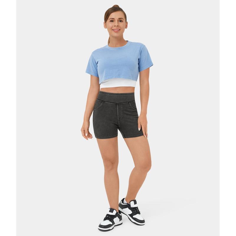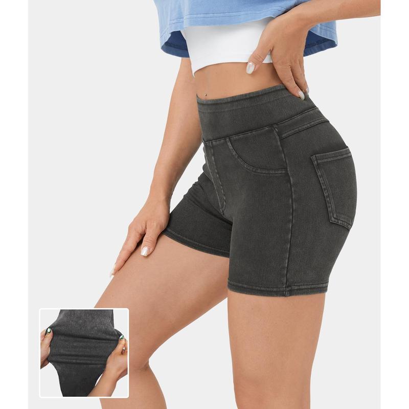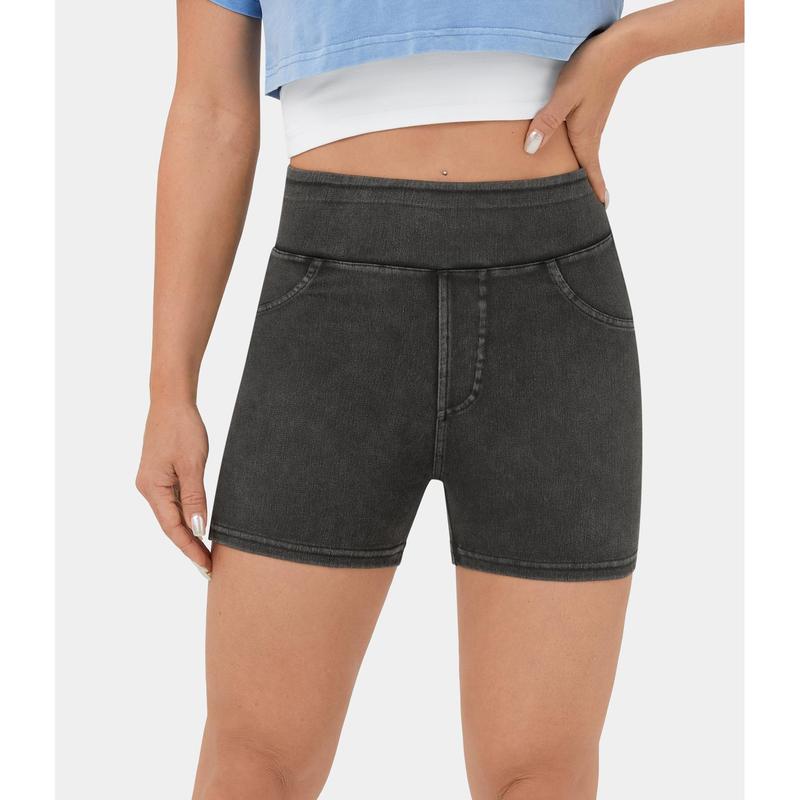 Halara Flex High Waisted Back Side Pocket Stretchy Knit Denim Casual Shorts 3"