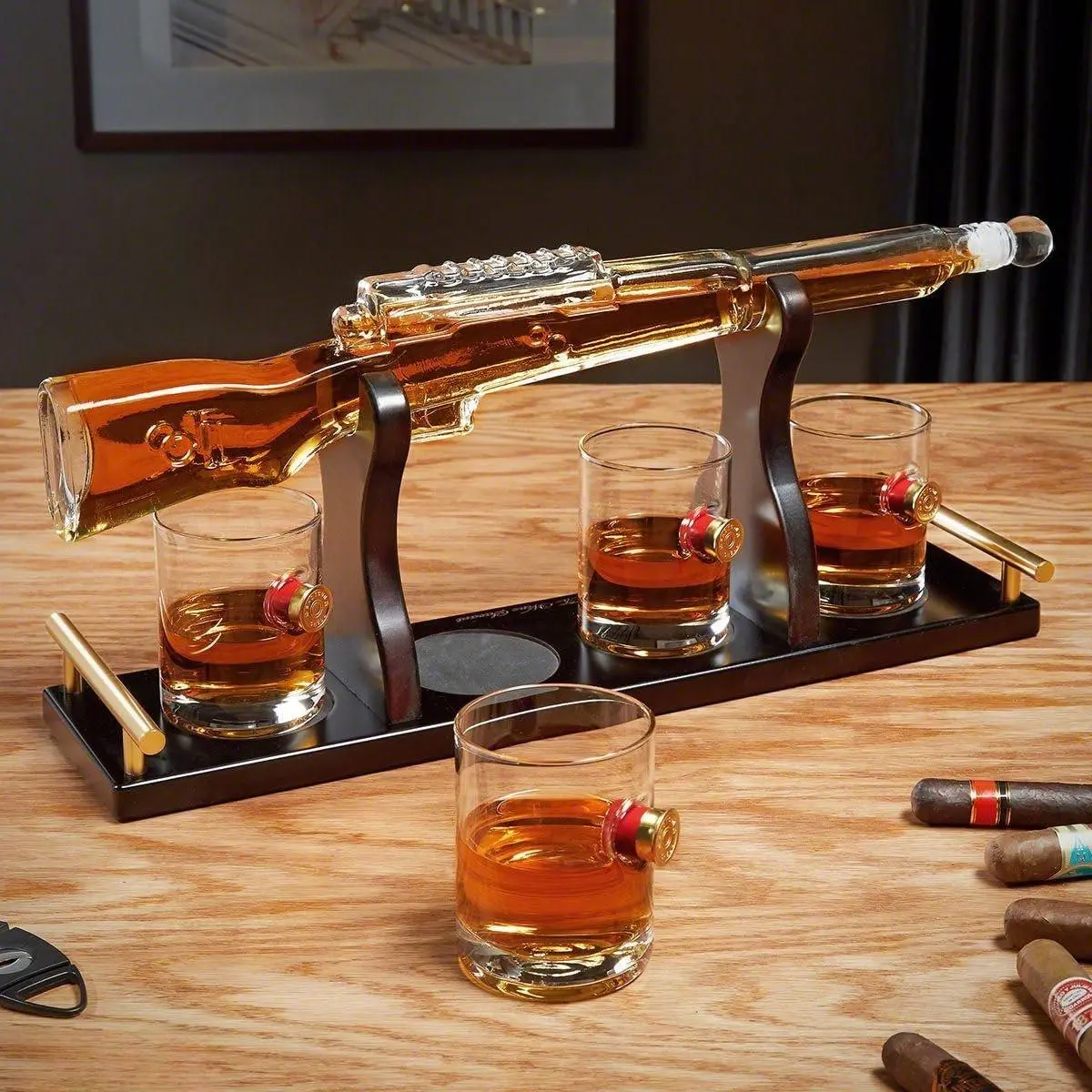 ·Beautifully Crafted Just for You – Gun whiskey holder set features a sleek wooden stand and unique glasses embedded with real shotgun shells.