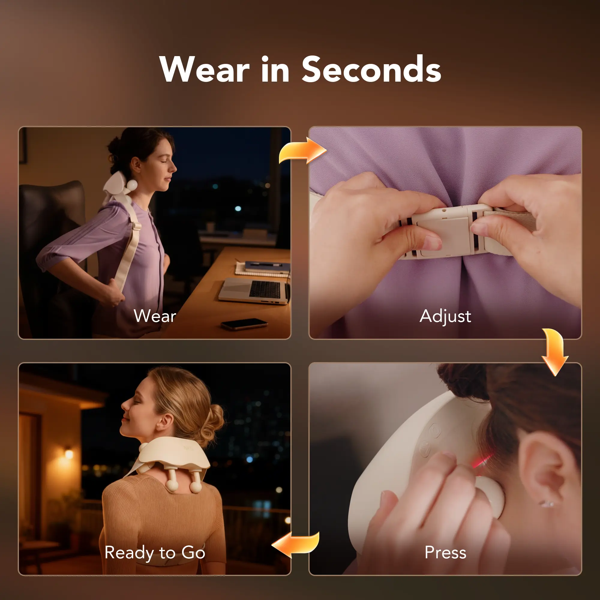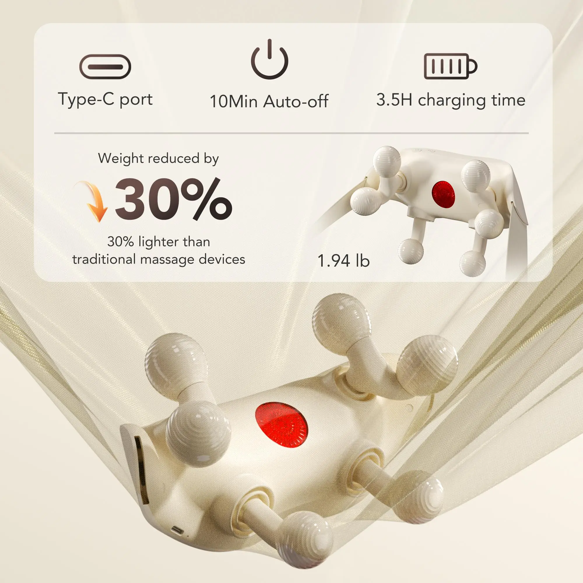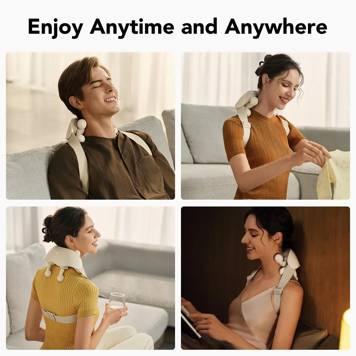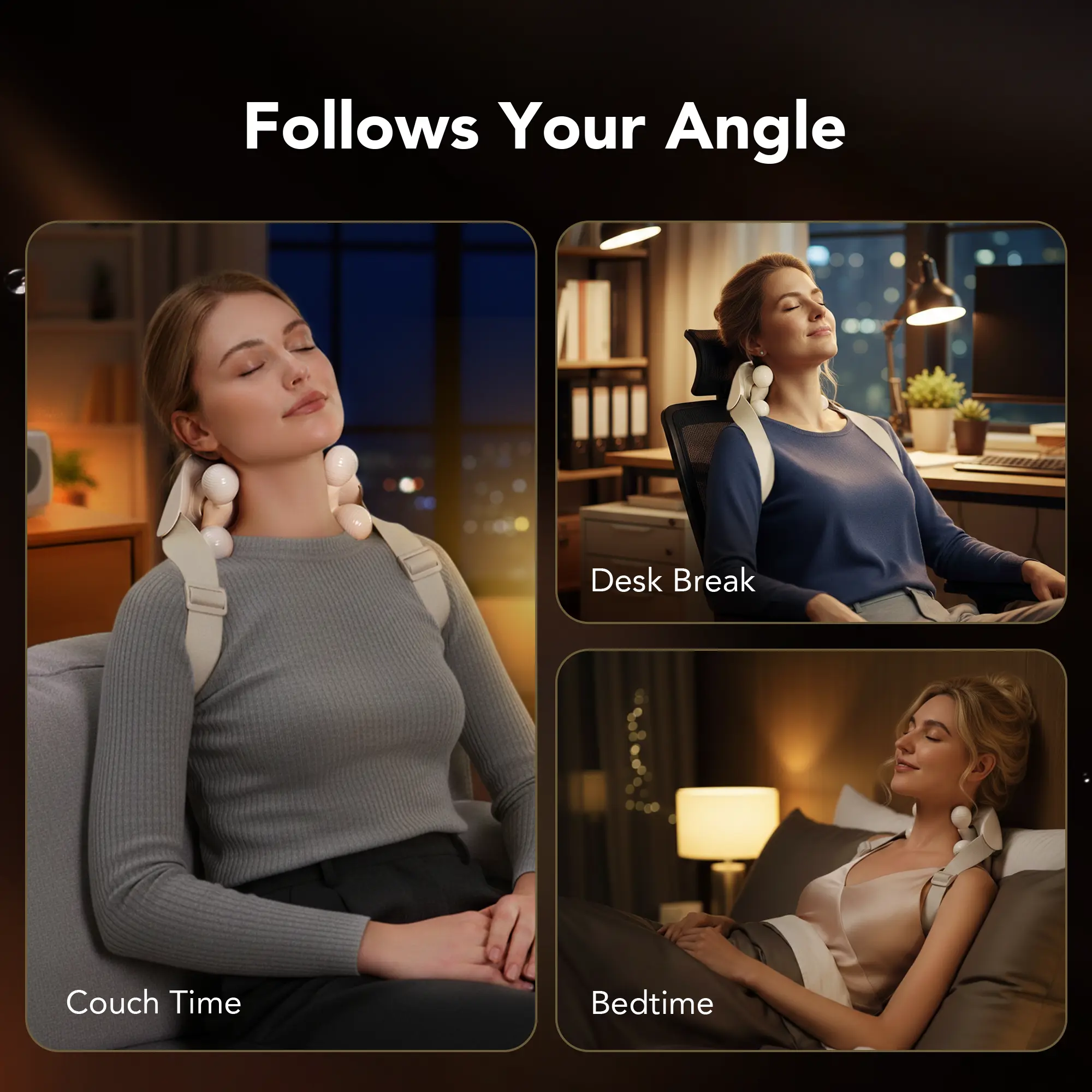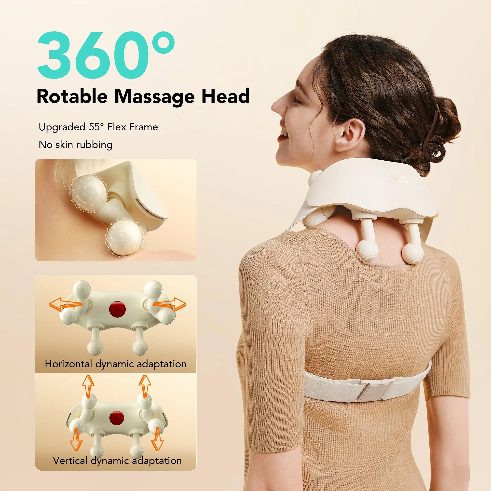 With a flexible 50° bendable frame and soft-touch silicone, it comfortably hugs all neck and shoulder shapes—no pinching, no slipping, just pure comfort.