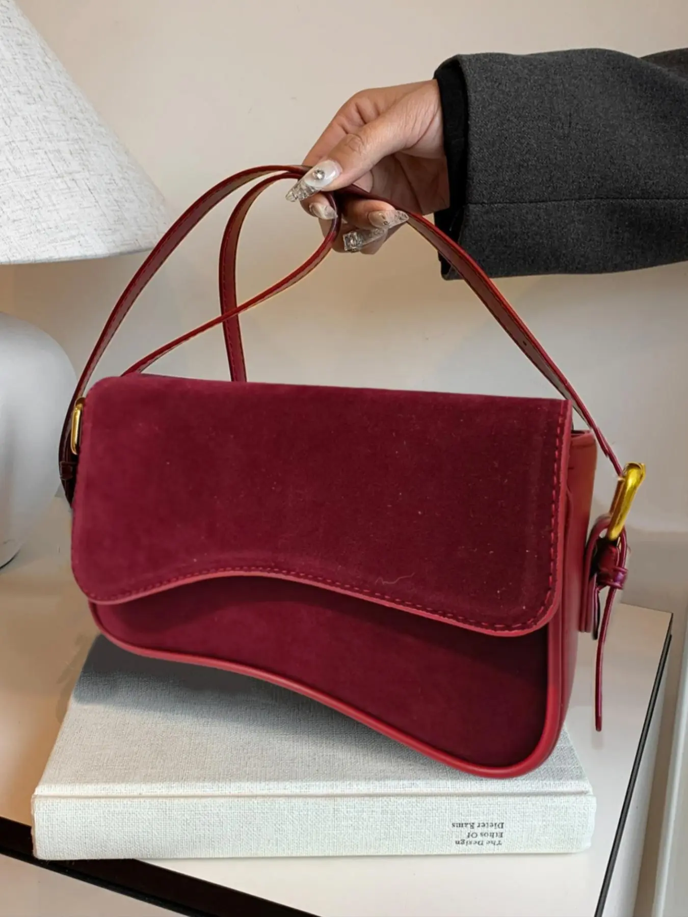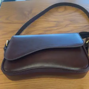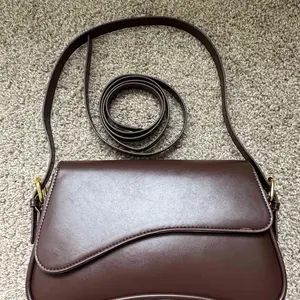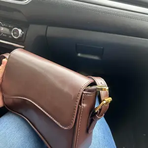 This brown shoulder bag has a sleek, minimalist design with a unique wavy flap detail that adds a touch of elegance. The faux leather material has a smooth finish, giving it a sophisticated look.