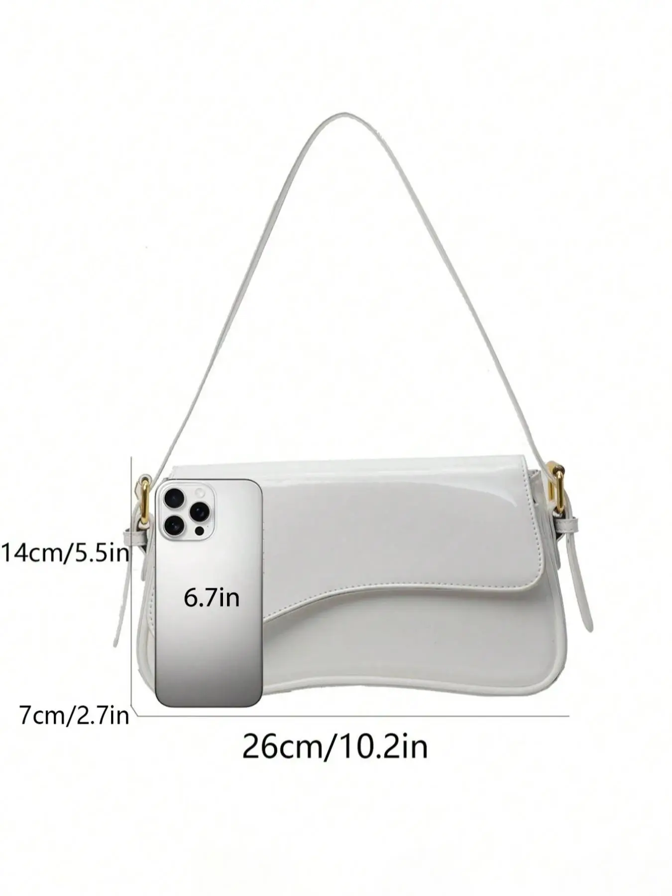 Love the ergonomic handle, the faux pearl leather, and the strong magnets on the opening the purse. Room for phone, makeup, and credit/debit cards. The purse has a shoulder strap but I don’t plan on using it. This purse is definitely a stand alone piece!