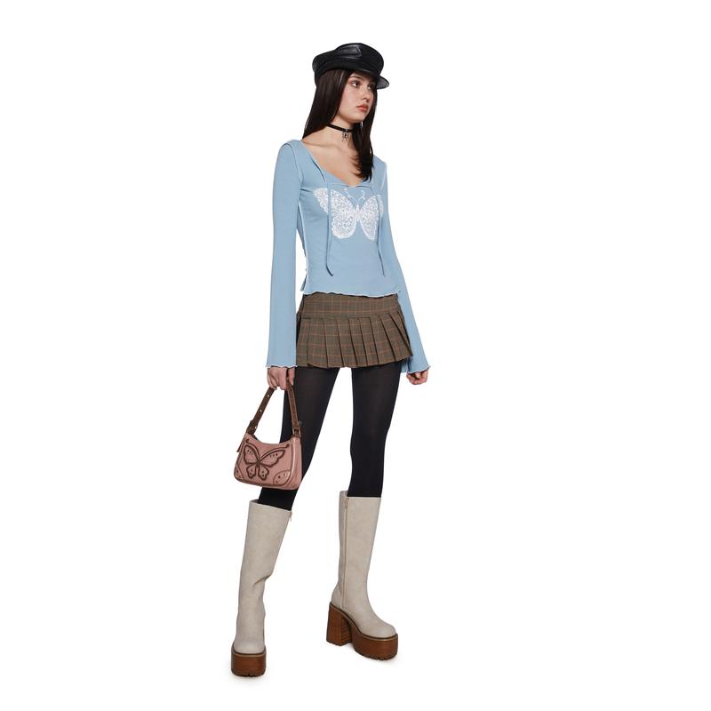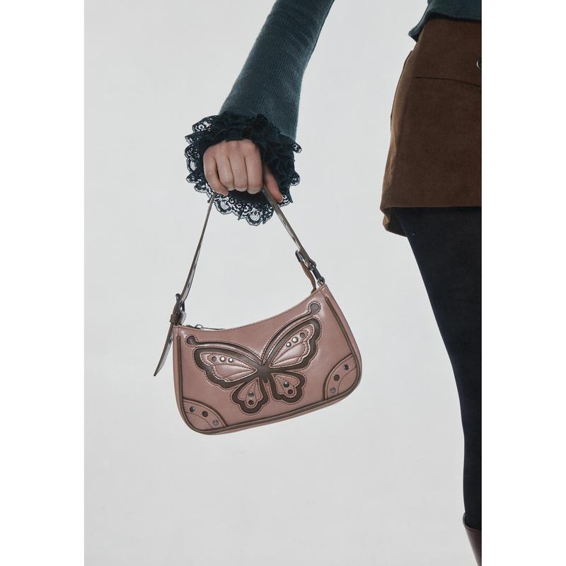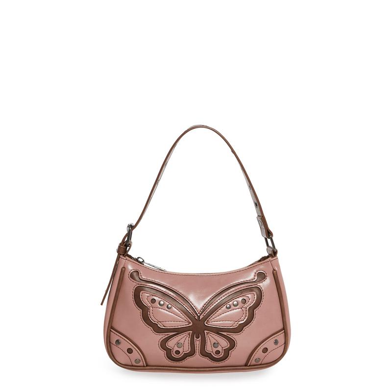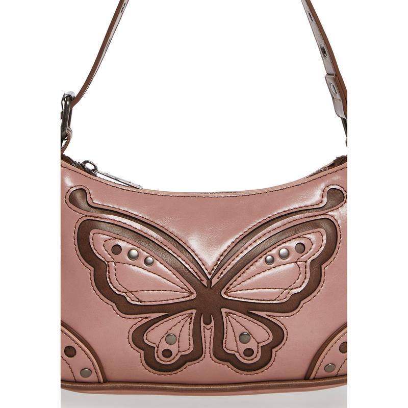 Take a chance with this shoulder bag that has a smooth vegan leather construction, an adjustable shoulder strap, a butterfly applique on the front, and a top zipper closure.