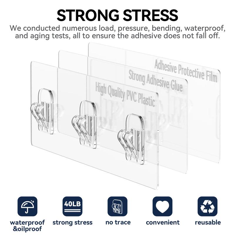 Sticks very well to shower tiles and has a strong hold when hooking items on it, strong enough to hold heavy winter coats