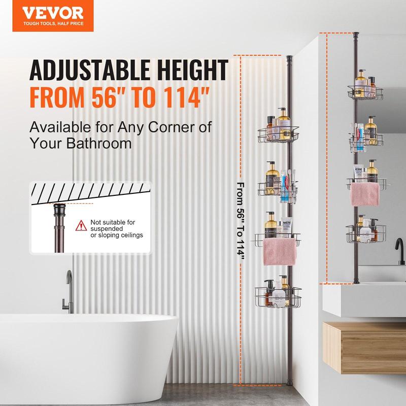 ·Adjustable Height: The shower corner caddy tension pole is designed for bathrooms with different heights. It supports 56" to 114" range adjustment, easily adapts to a variety of installation environments, making storage more convenient. To ensure safety and stability, please do not install on the ceiling or slanted ceiling.