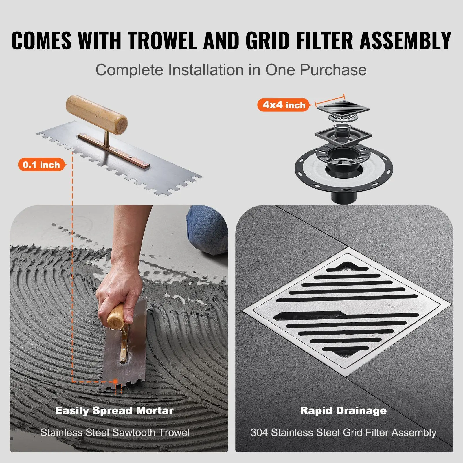 • Complete Professional Accessories: One-time purchase, easy installation throughout! Equipped with stainless steel serrated trowel for easy mortar application. 304 stainless steel grid filter ensures fast drainage, enhancing your user experience.