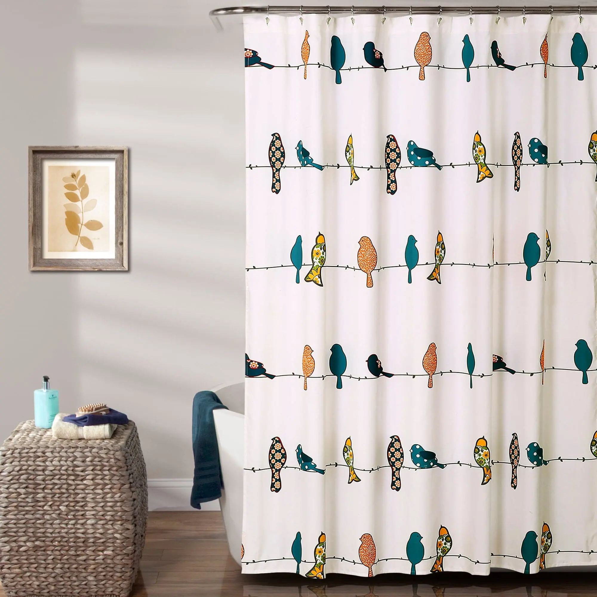 The Rowley Birds Shower Curtain brings a city vibe to your home with its eclectic design of colorful birds on wires. Perfect for creating a chic, boho, coastal, or farmhouse style. Ideal for first apartments, guest bathrooms, or teenager's bathrooms.