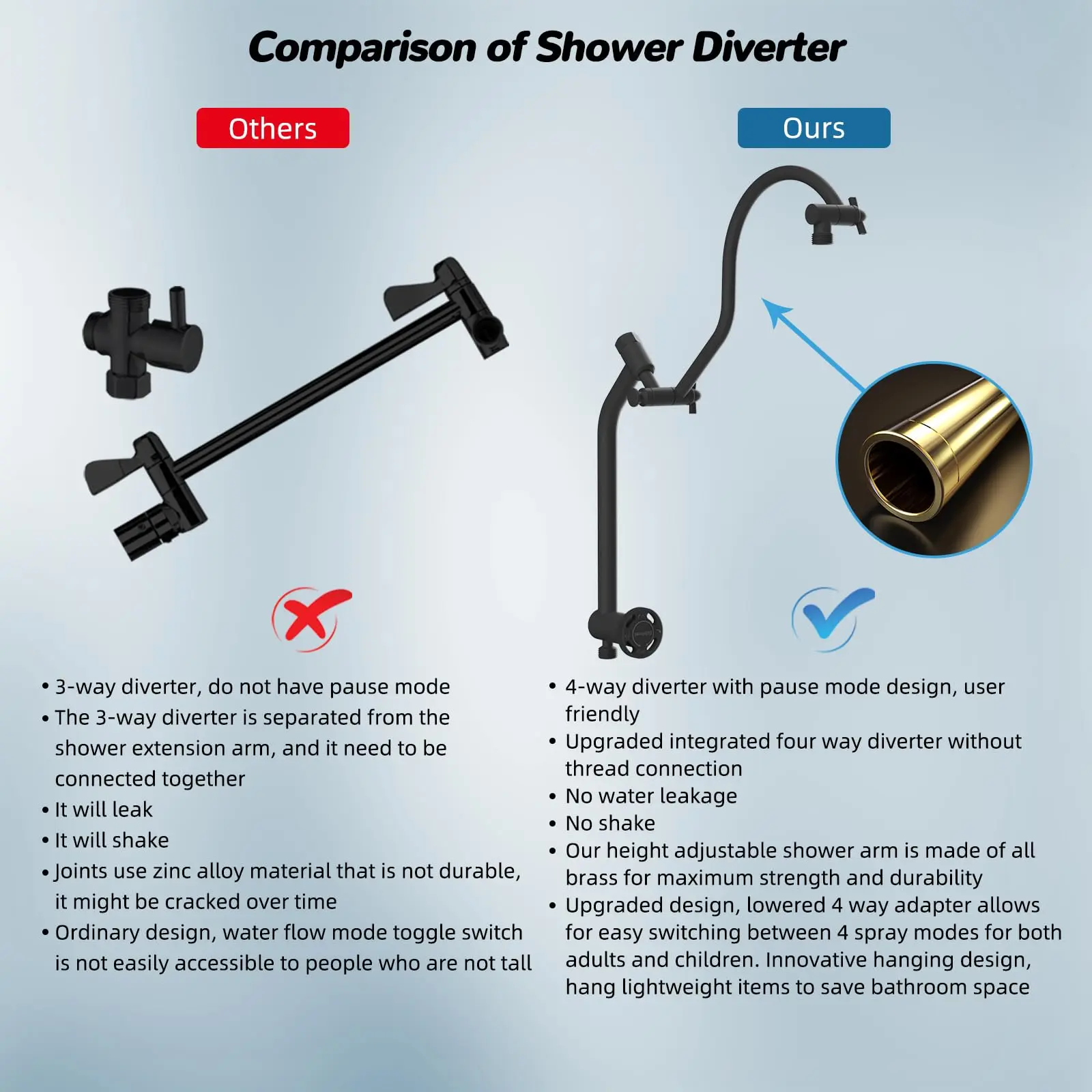 ·[Easy Reach 4 Way Diverter Shower Extension Arm] The innovative 4-way diverter shower arm is crafted from long-lasting all-metal material, ensuring strength while preventing leaks and wobbling with its integrated design. It offers a versatile combination of four spray modes: Handheld Spray, Rainfall Spray, Rainfall + Handheld Spray, and Pause Mode, catering to all your showering needs. The lowered 4 way diverter design is suitable for both adults and children, while the adjustable handheld holder allows for various angles and is longer than standard brackets, minimizing splashes and enhancing your overall shower experience