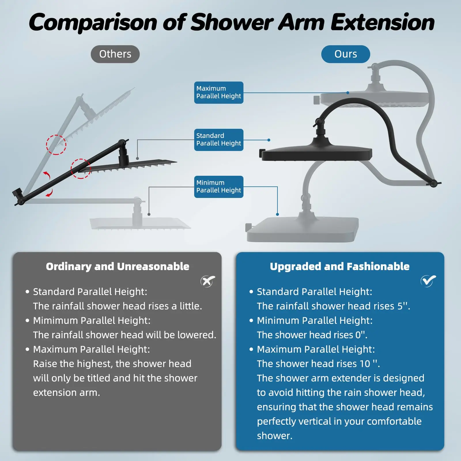 ·[Upgraded Integrated Curvered Shape Extension Arm] The integrated shower extension arm ensures a tight seal, preventing any water leaks and guaranteeing safe water usage. Unlike standard shower arm extenders, the Hibbent shower arm equiped with upgraded curved shape shower arm which allows you to raise or lower the shower head while keeping it in a horizontal position, preventing any collisions with the arm. The height-adjustable handheld shower head holder can be easily adjusted to accommodate different heights, which is designed for convenient use by everyone, including the elderly, children, adults, and wheelchair users