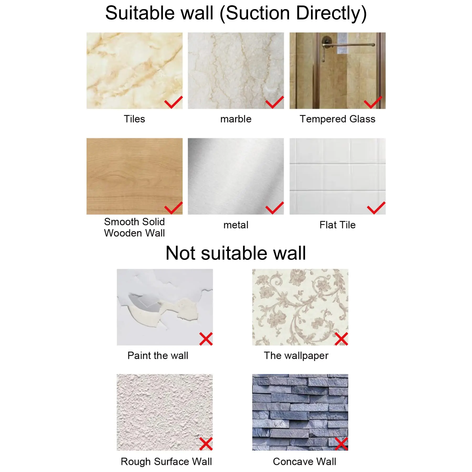 ·[Compatibility & Widely Used] With a 3/4'' slot diameter, this shower head holder is compatible with most standard showerheads available in the market. The shower wand holder is designed to adhere securely to smooth surfaces like ceramic tile, glass, smooth wood, and smooth metal surfaces. However, please note that the suction cup isn't suitable for painted walls, rough surfaces, concave walls, or wallpaper.