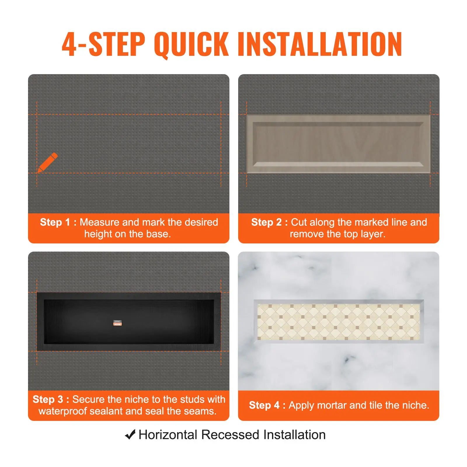 • Easy Installation: Equipped with a complimentary installation kit, horizontal embedded installation, you only need to follow the following steps to complete. These shower niche shelves can be installed without complicated procedures.