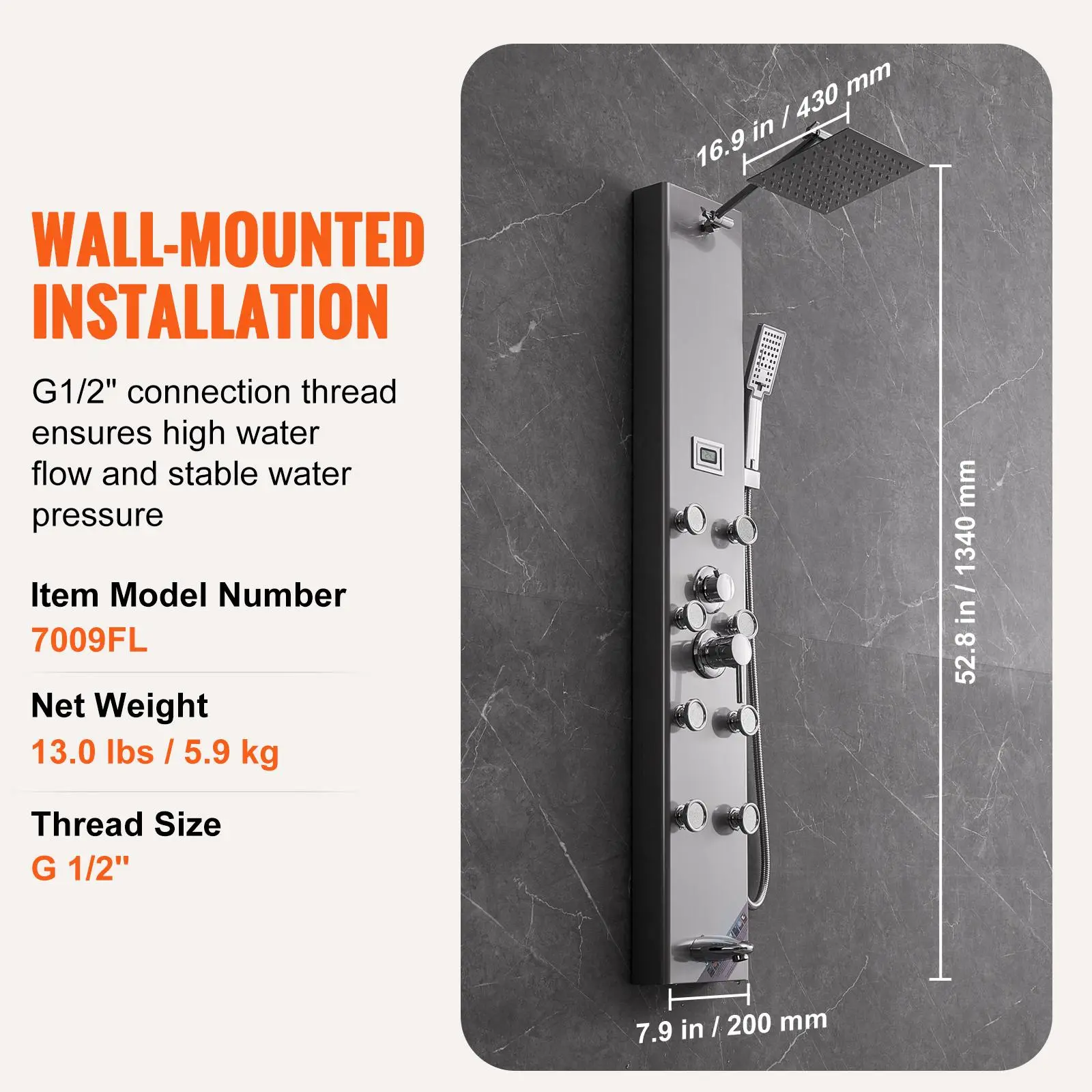 • Wall-Mounted, Easy Installation: Equipped with G 1/2" interface for consistent high flow rate and stable water pressure. This shower head system includes a brass mixing valve and PVC double explosion-proof pipe, with a 304 stainless steel braided nozzle for a robust and leak-proof design. Comes with detailed instructions for quick assembly. Note: Please prepare two 1.5V dry batteries for display.