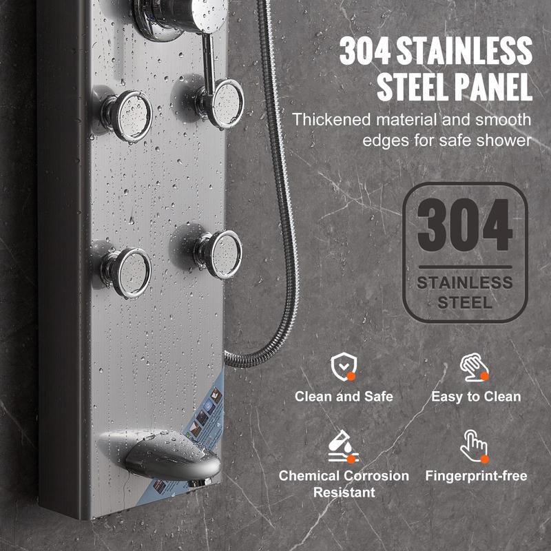 • 304 Stainless Steel Material: Crafted from high-quality 304 stainless steel for safety and durability. The shower panel tower is thick and resistant to fingerprints, rust, and corrosion. Ensuring easy cleaning for lasting beauty and hygiene.