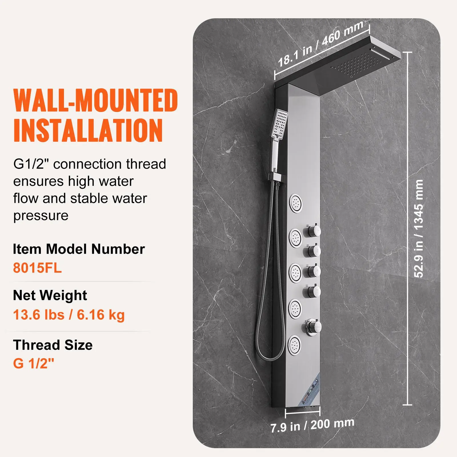 • Wall-Mounted, Easy Installation: Equipped with G 1/2" interface for consistent high flow rate and stable water pressure. This shower head system includes a brass mixing valve and PVC double explosion-proof pipe, with a 304 stainless steel braided nozzle for a robust and leak-proof design. Comes with detailed instructions for quick assembly.