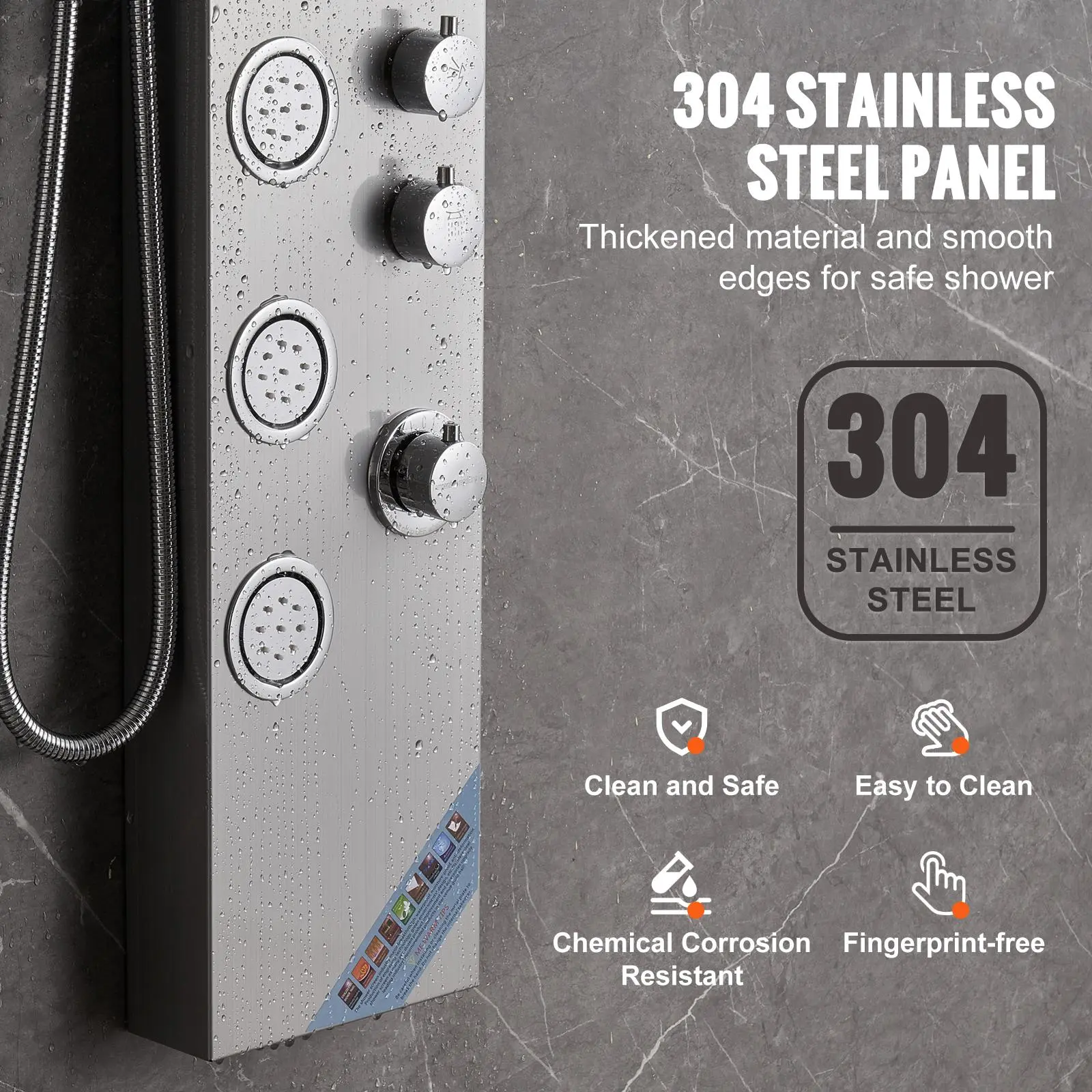 • 304 Stainless Steel Material: Crafted from high-quality 304 stainless steel for safety and durability. The shower panel tower is thick and resistant to fingerprints, rust, and corrosion. Ensuring easy cleaning for lasting beauty and hygiene.