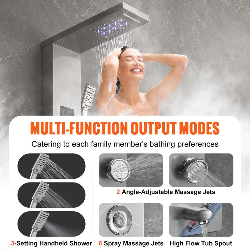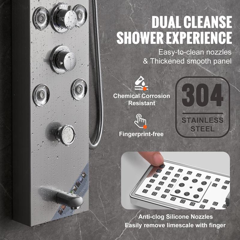 • Anti-Clog Nozzles & 304 Stainless Steel: Our shower tower system features 2 angle-adjustable massage jets, 6 spray massage jets and a 3-setting shower head to accommodate users of all heights, including children. Featuring silicone nozzles for easy blockage removal and prevention of scale buildup. Crafted from high-quality 304 stainless steel, our panel is resistant to fingerprints, rust, and corrosion, ensuring lasting beauty and hygiene.