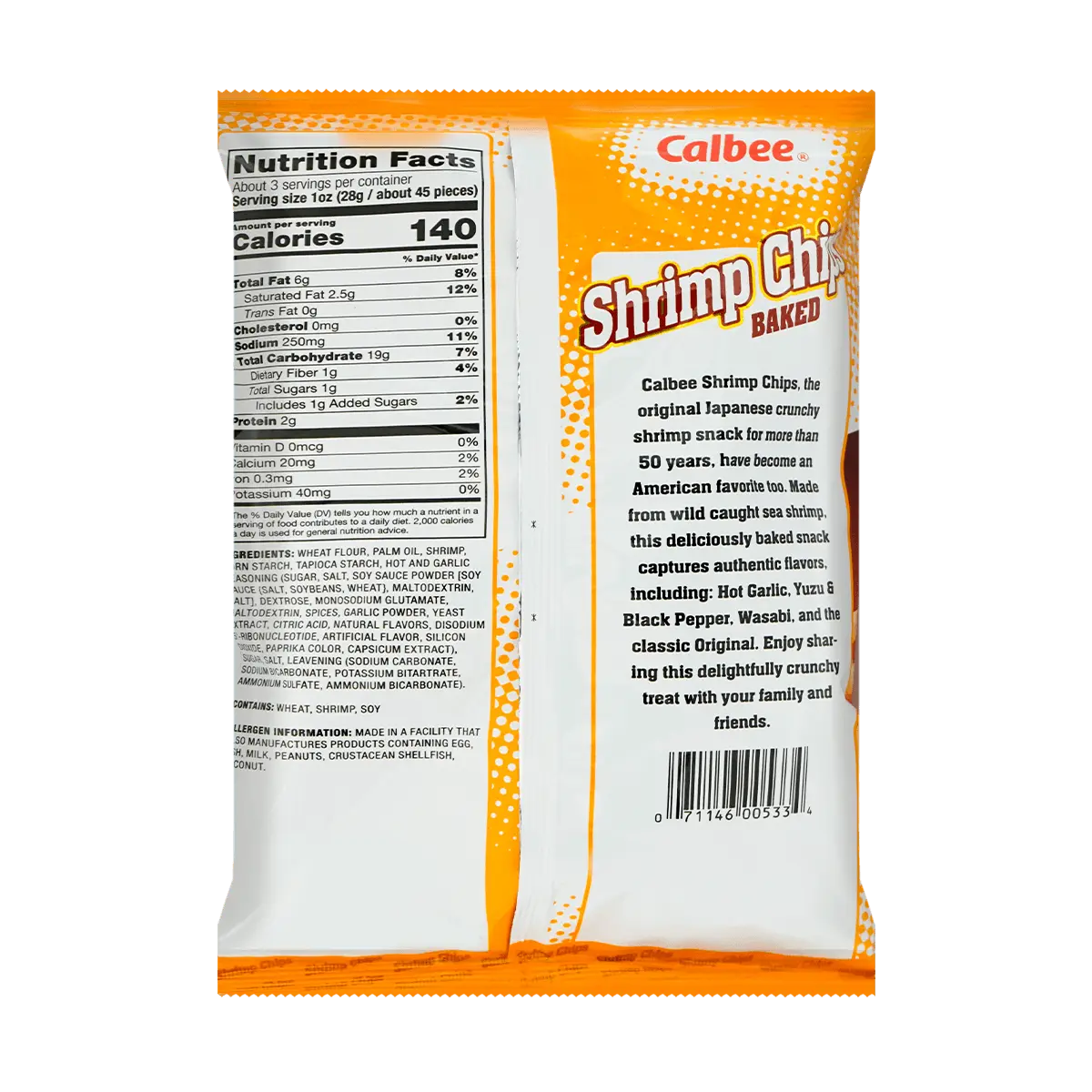 ·East meets West as Calbee Shrimp Chips captures the authentic flavor of natural,wild shrimp in this delicious,baked snack.