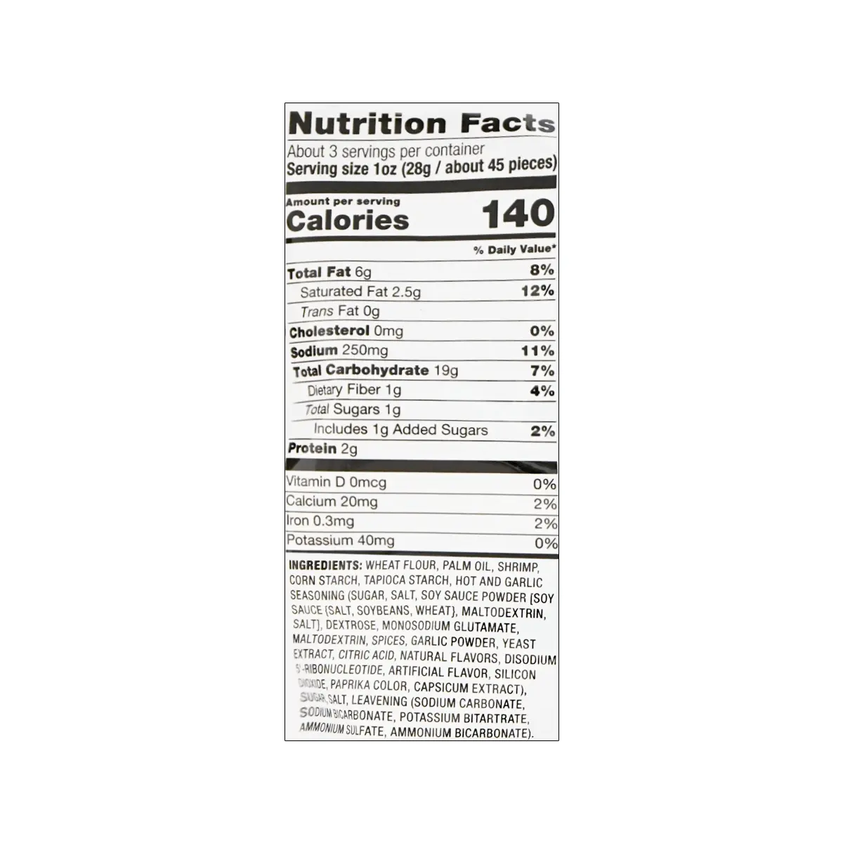 ·Wheat Flour, Palm Oil, Shrimp, Corn Starch, Tapioca Starch, Hot and Garlic Seasoning (Sugar, Salt, Soy Sauce Powder(Salt, Soybeans, Wheat), Maltodextrin, Salt) Dextrose, Monosodium Glutamate, Maltodextrin, Spices, Garlic Powder, Yeast Extract, Citric Acid, Natural Flavors, Disodium 5' Ribonucleotide, Artificial Flavor, Silicon Dioxide, Paprika Color, Capsicum Extract), Sugar, Salt, Leavening (Sodium Carbonate, Sodium Bicarbonate, Potassium Bitartrate, Ammonium Sulfate, Ammonium Bicarbonate).