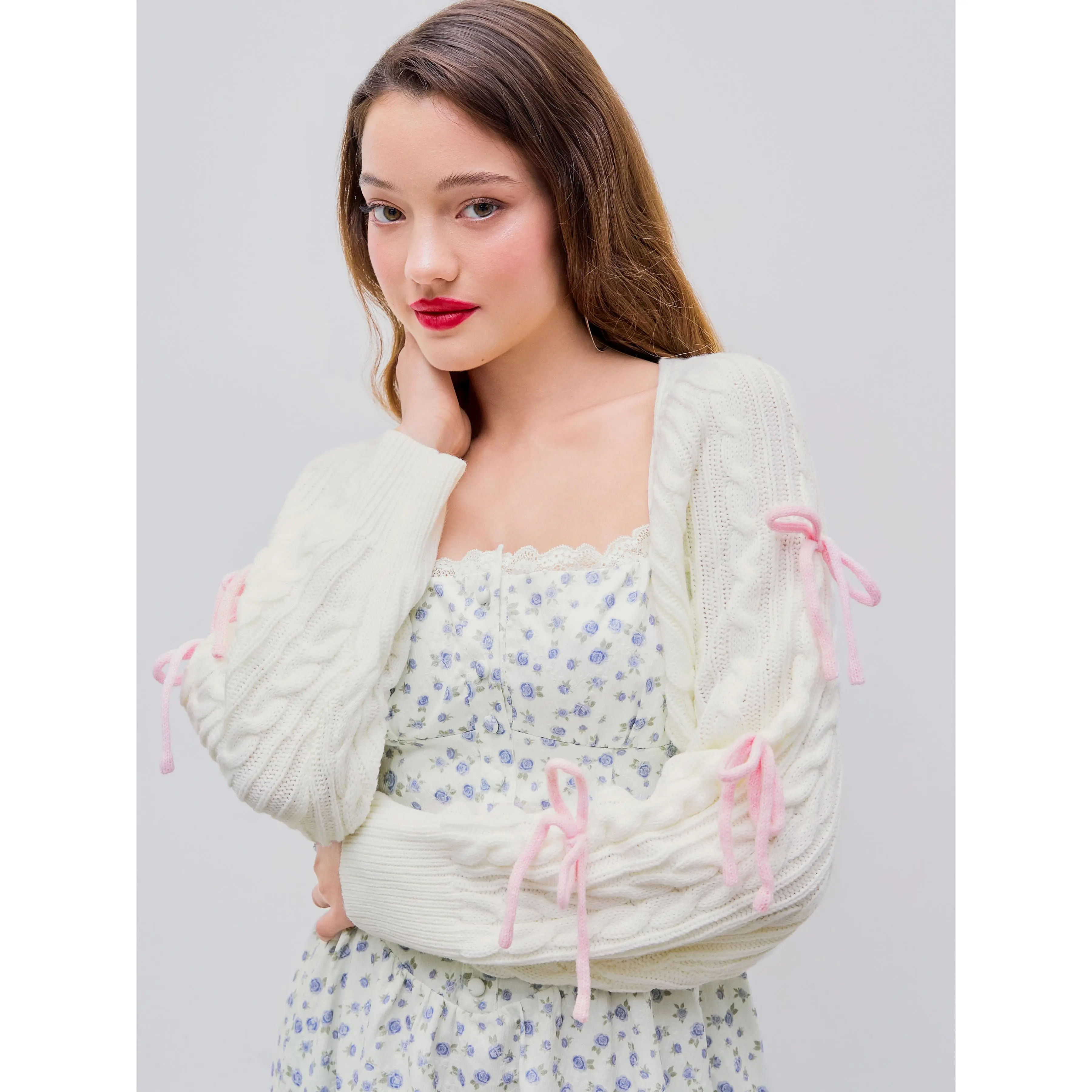 Cider [3 colors, size 0-10] Cable Knit Bowknot Long Sleeve Shrug