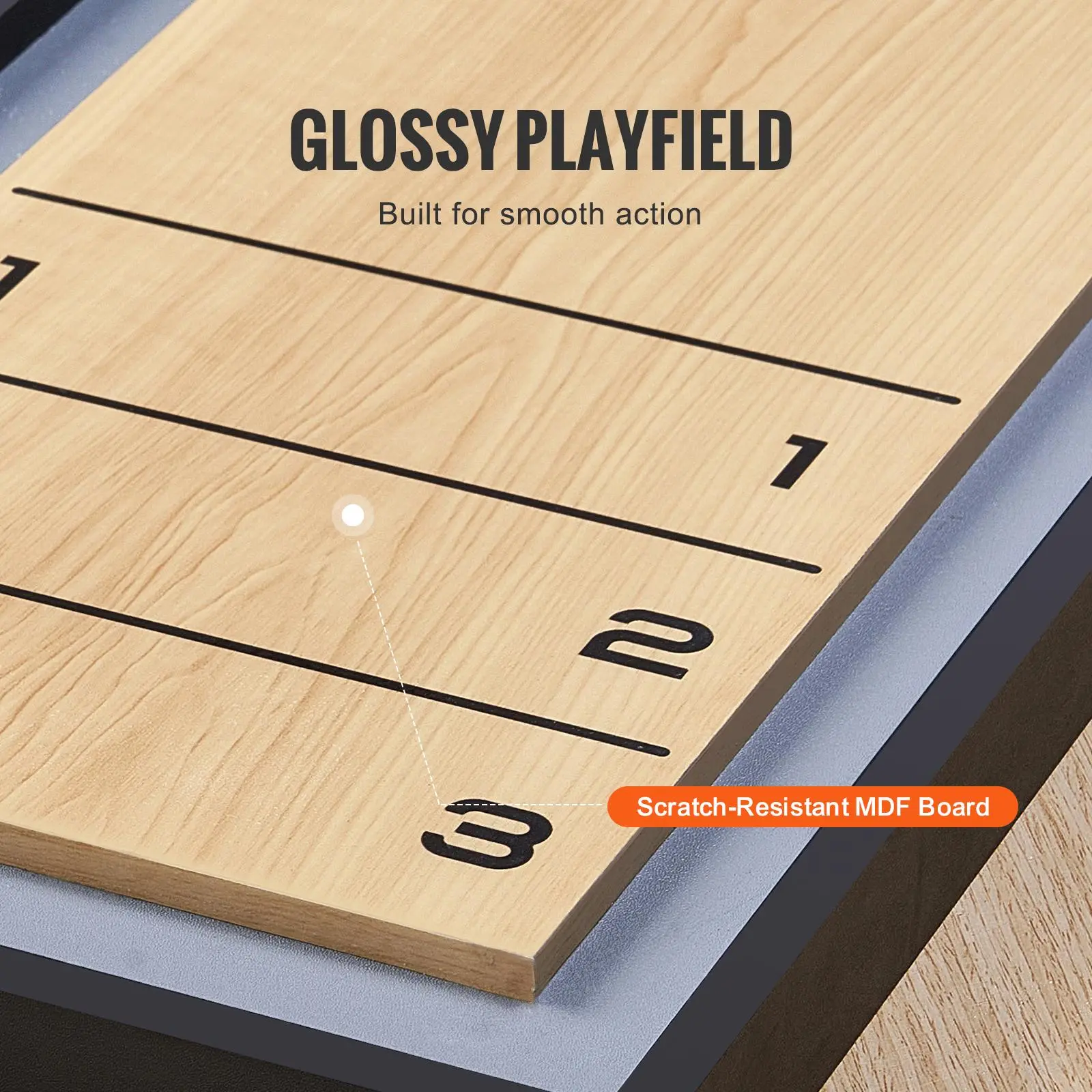 • Glossy Playfield: Our shuffleboard table is built for smooth action with a scratch-resistant MDF board, ensuring durability and sleek performance.