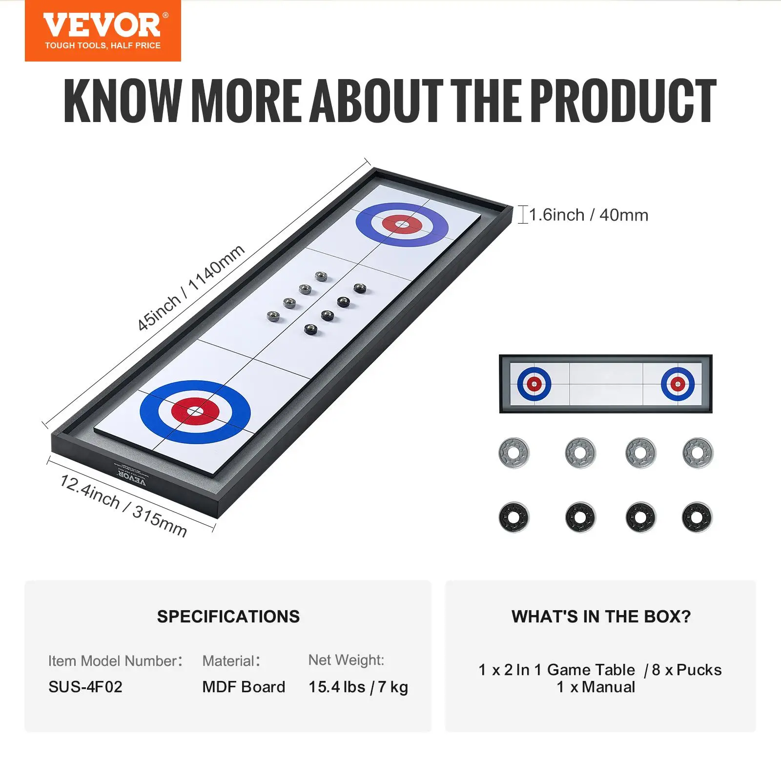 • 2-Sided Playing Board: Experience double the fun with your family, featuring shuffleboard on one side and curling on the other.